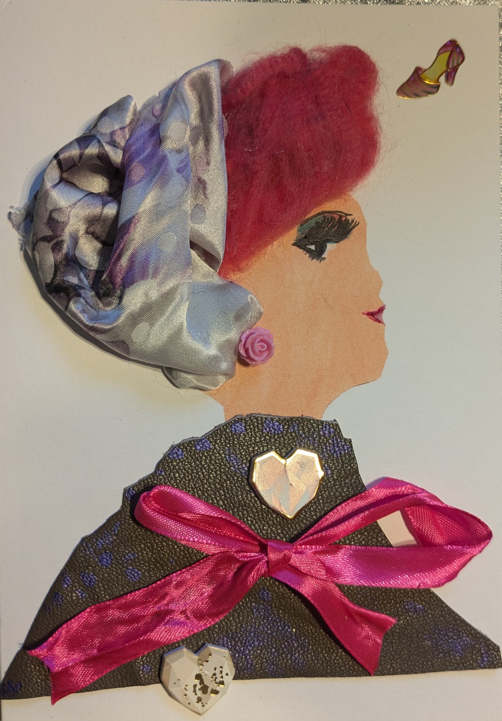 I made this cards showing woman wearing red and blue bandana and galaxy blouse with pink bow. She had