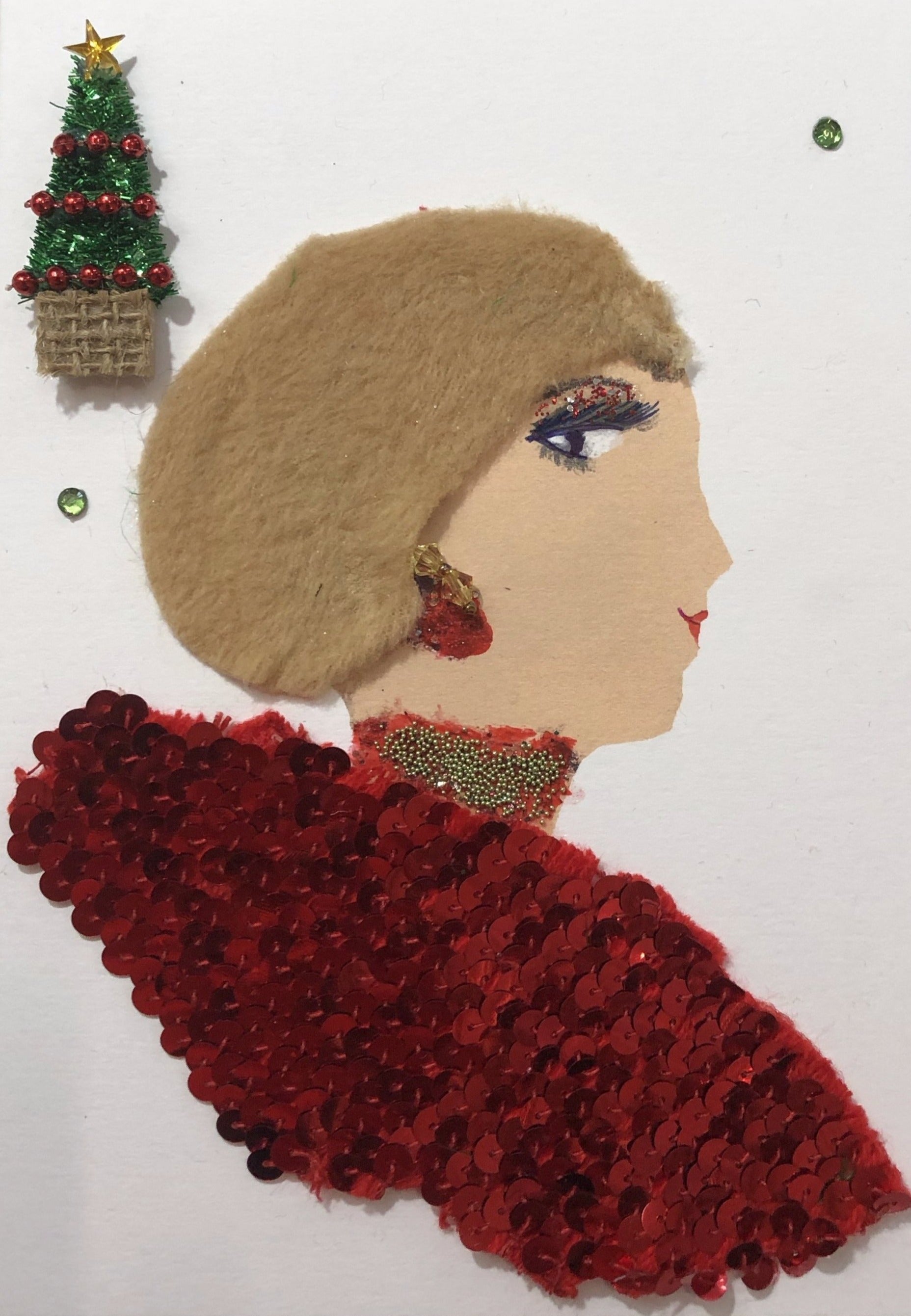 Valerie is a beautiful woman in a sequined red dress. There is a Christmas tree to the left of her head.