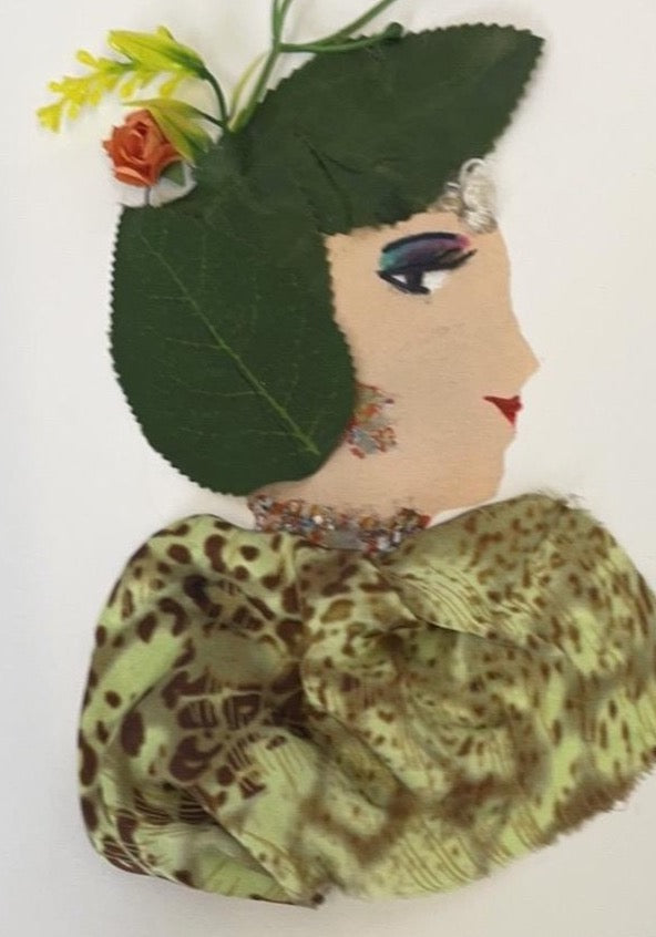 Jadesola Jakkie is wearing a rich green animal print blouse and a leafy green hat with a beautiful flower stemming from it. She is also wearing alluring beaded jewellery.