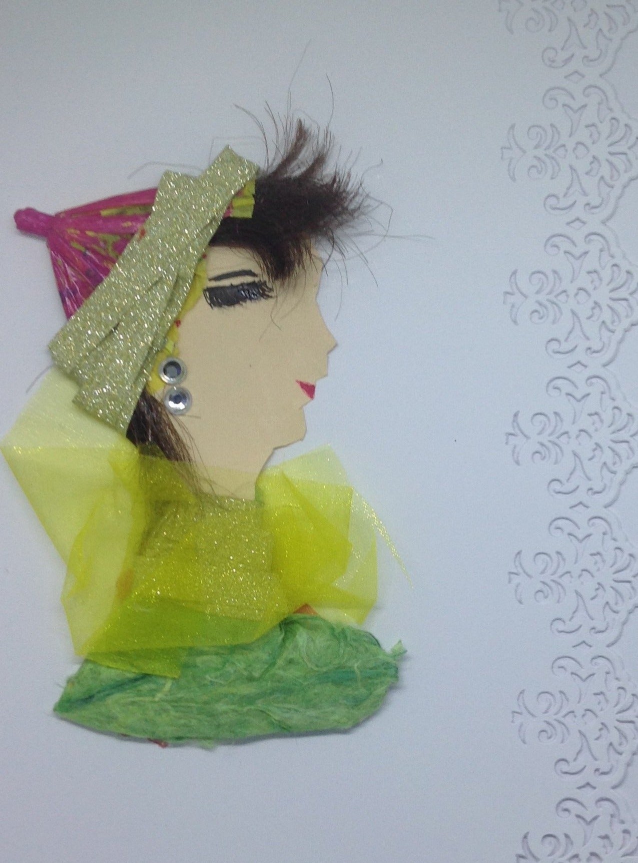 She is wearing a green top with a yellow collar accessory. She has a pink and gold hat on as well.