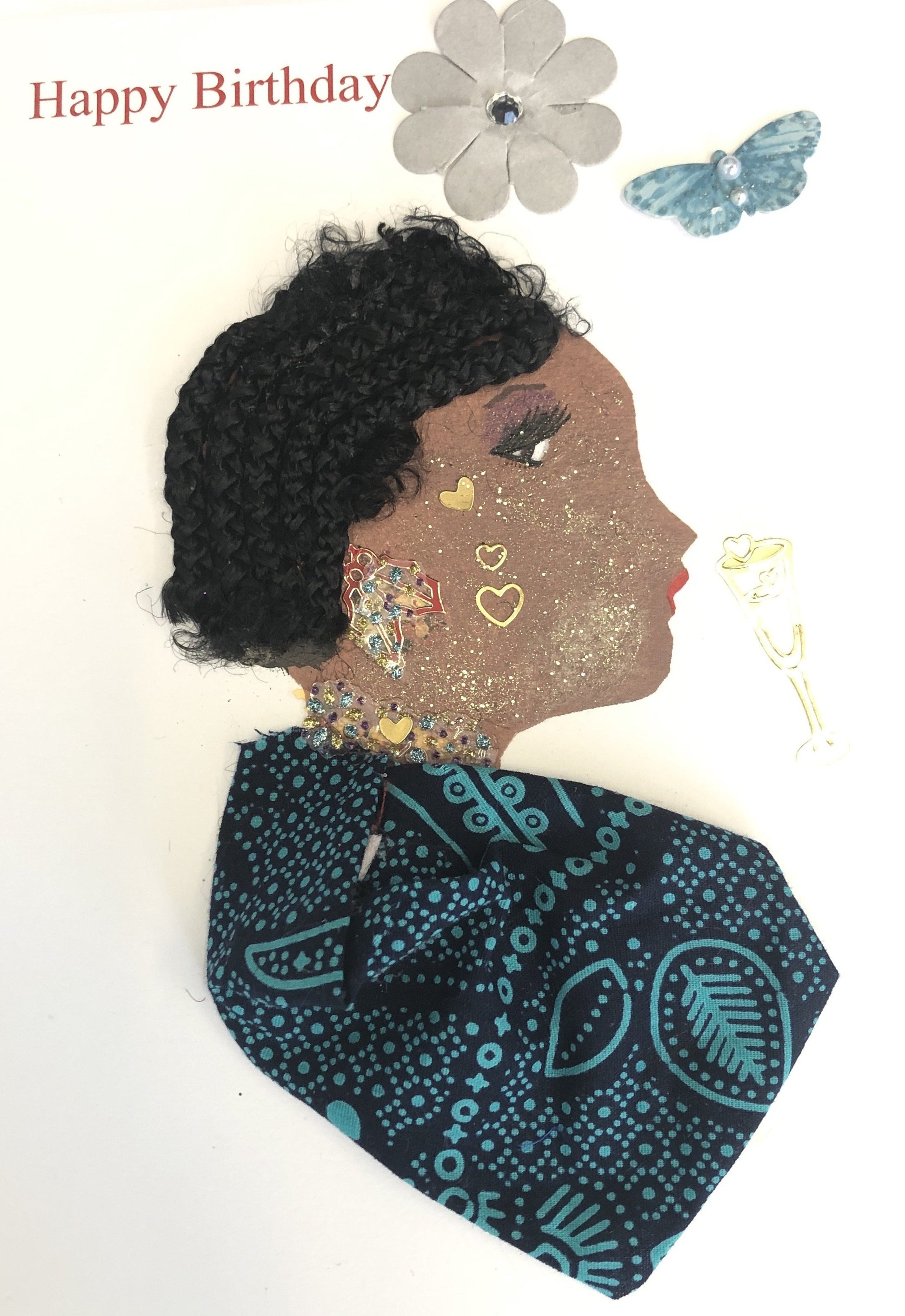 Wearing a beautiful turquoise scarf and displaying glitter and sparkles. At the top, it says "Happy Birthday" in pink with a white flower and blue butterfly.