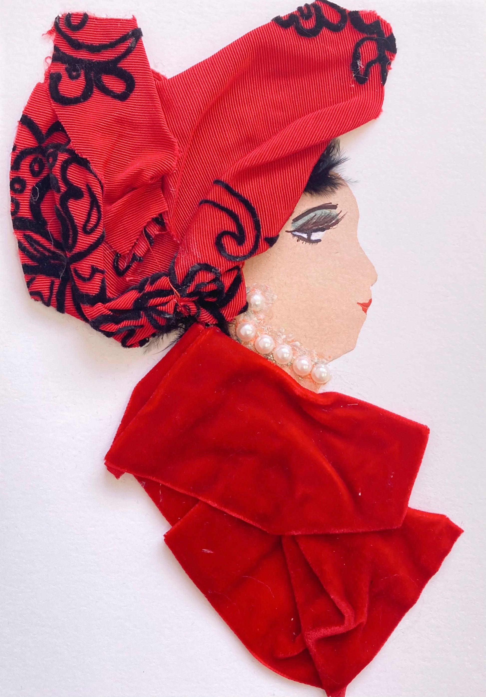 Juliet Jubilee is wearing a dark red dress with diamond circle earrings/necklaces and has a red and black patterned headscarf.