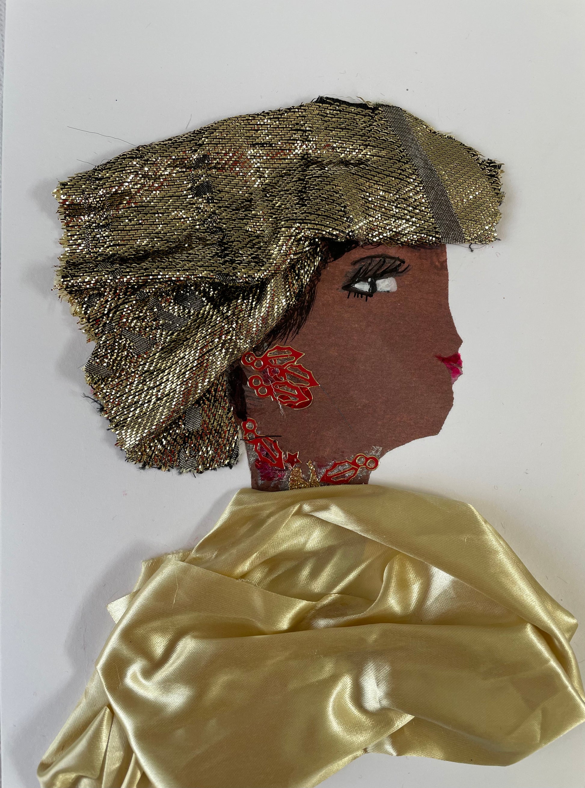 Josephine James is wearing a gold blouse with a matching red set of earrings and necklace. She has a predominately coloured gold head wrap on with bits of black and silver sequins throughout