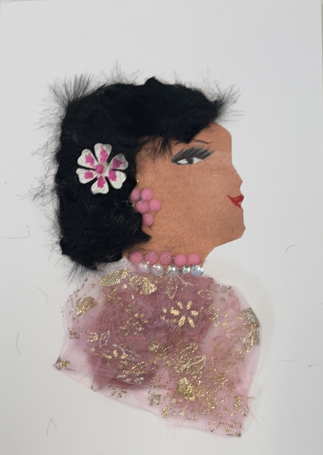Kagami Shanghi is wearing an elegant pink blouse with gold detailing. She has black hair with a pink and white flower in it. She is wearing pink beaded jewellery.