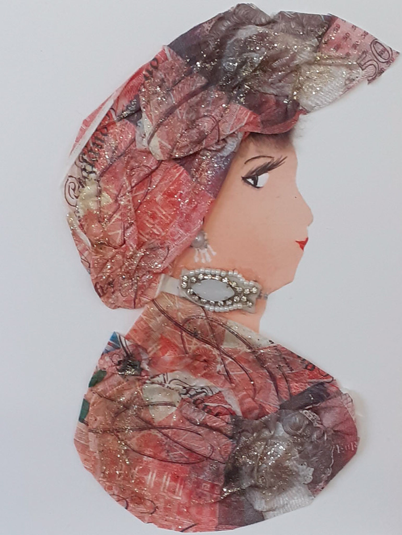 Mile End Money is wearing money printed hat with the same money print for her blouse. She is wearing her shining pearly beady necklace.