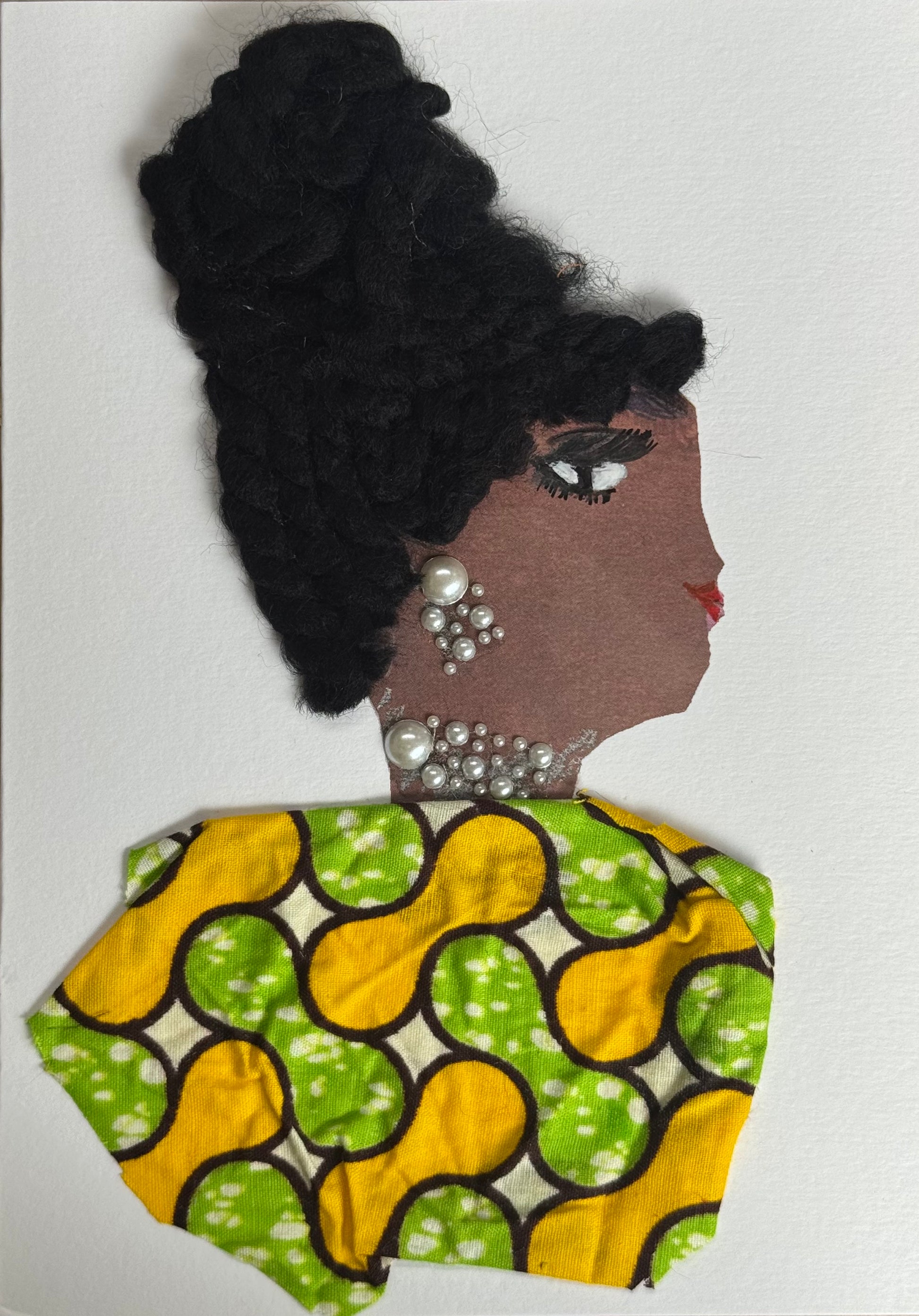 I made this handmade  birthday card of a woman named Chingford Max . Her thick braided bun is full of texture and volume, set above a bold blouse in green and yellow African-inspired print. Pearl gems along her ear and neckline complete her smooth and confident look.