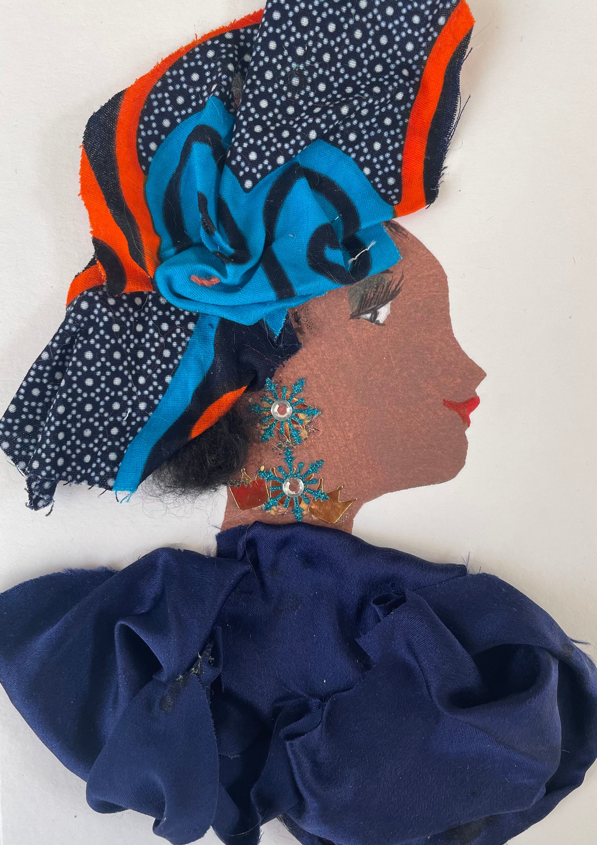 Doctor Sapphire Salute is wearing a navy blouse with a patterned headpiece that's coloured navy, orange, white and bright blue. She has snowflake blue diamanté necklace and earrings. There are 2 gold crowns at her neck.