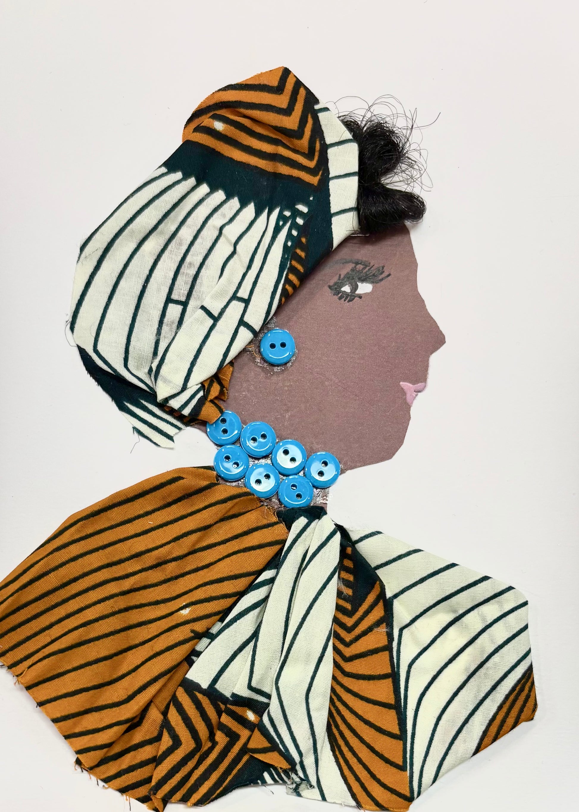 Feeling grateful for someone in your life? Grateful Gianna is here to brighten anyone's day! This handmade card features a woman with a multicoloured headwrap and blouse with whites and golden yellows. Her blue button jewellery adds a pop of colour to her look!