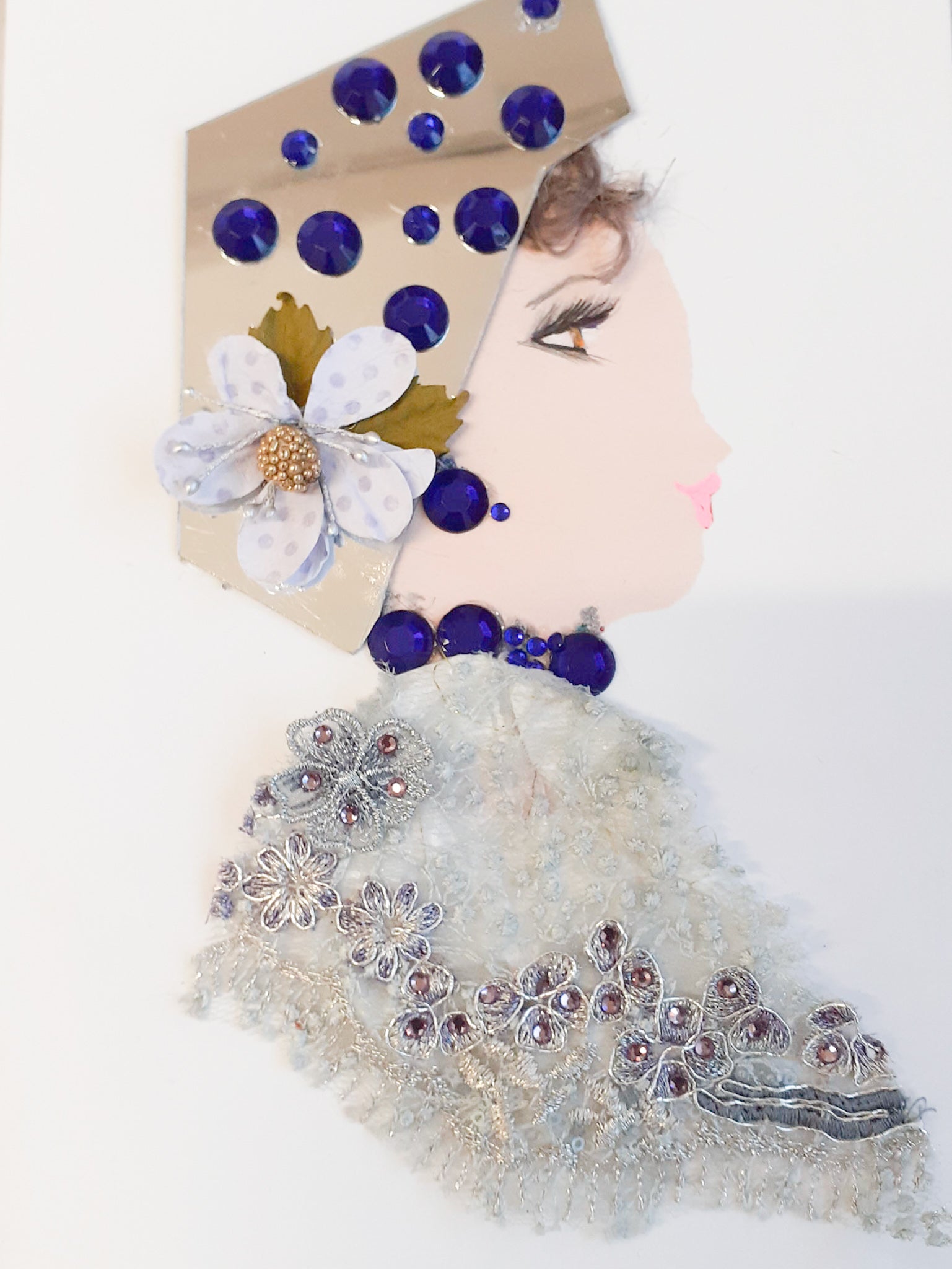 Doctor Cranbrook Crabo is wearing a silver dress with feathers and a blue sapphire necklace and earrings.