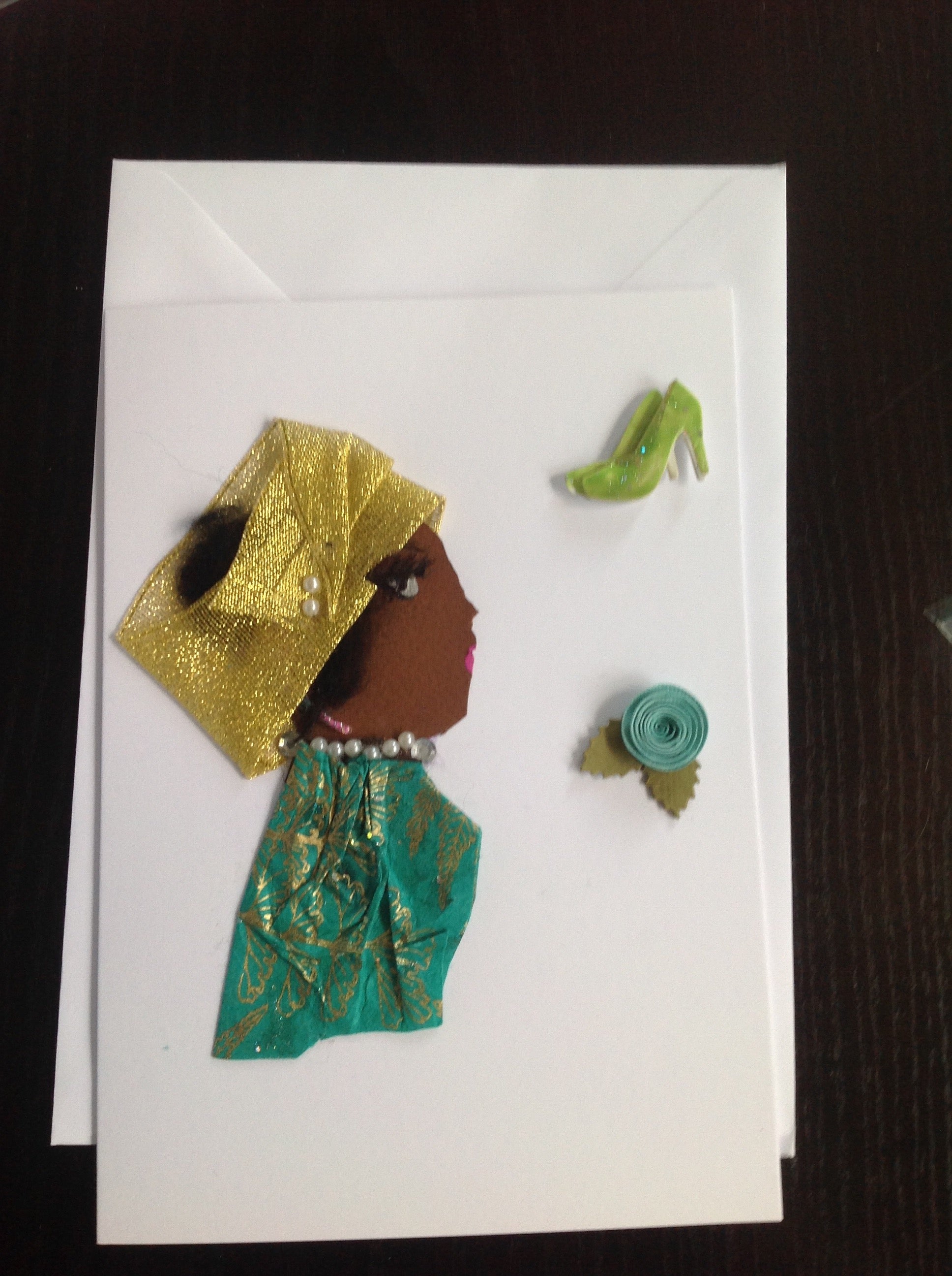 She is wearing a green printed top with a yellow headscarf. There is one blue flower and green heels to the right of her.
