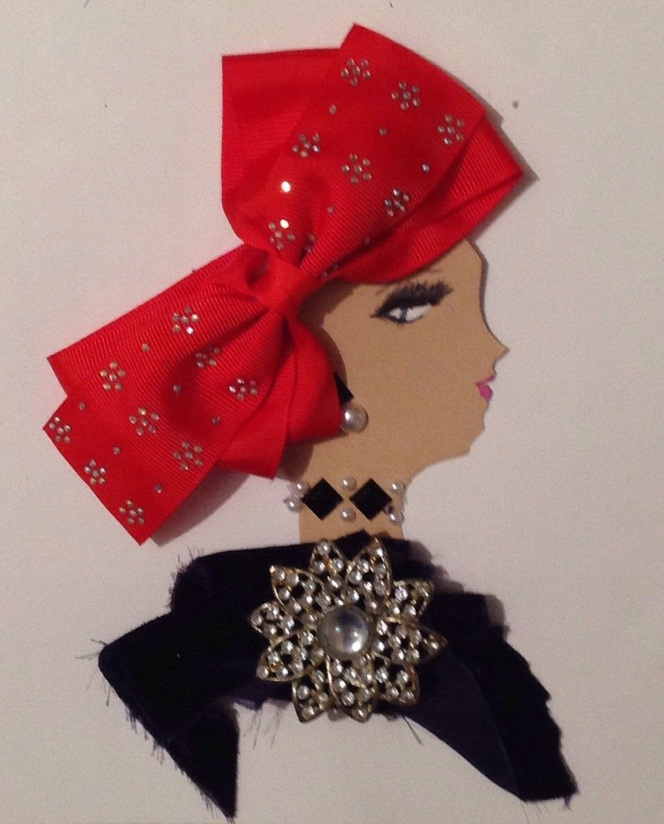 She is wearing a black top with a sparkly broach. There is a big red bow in her hair as well.