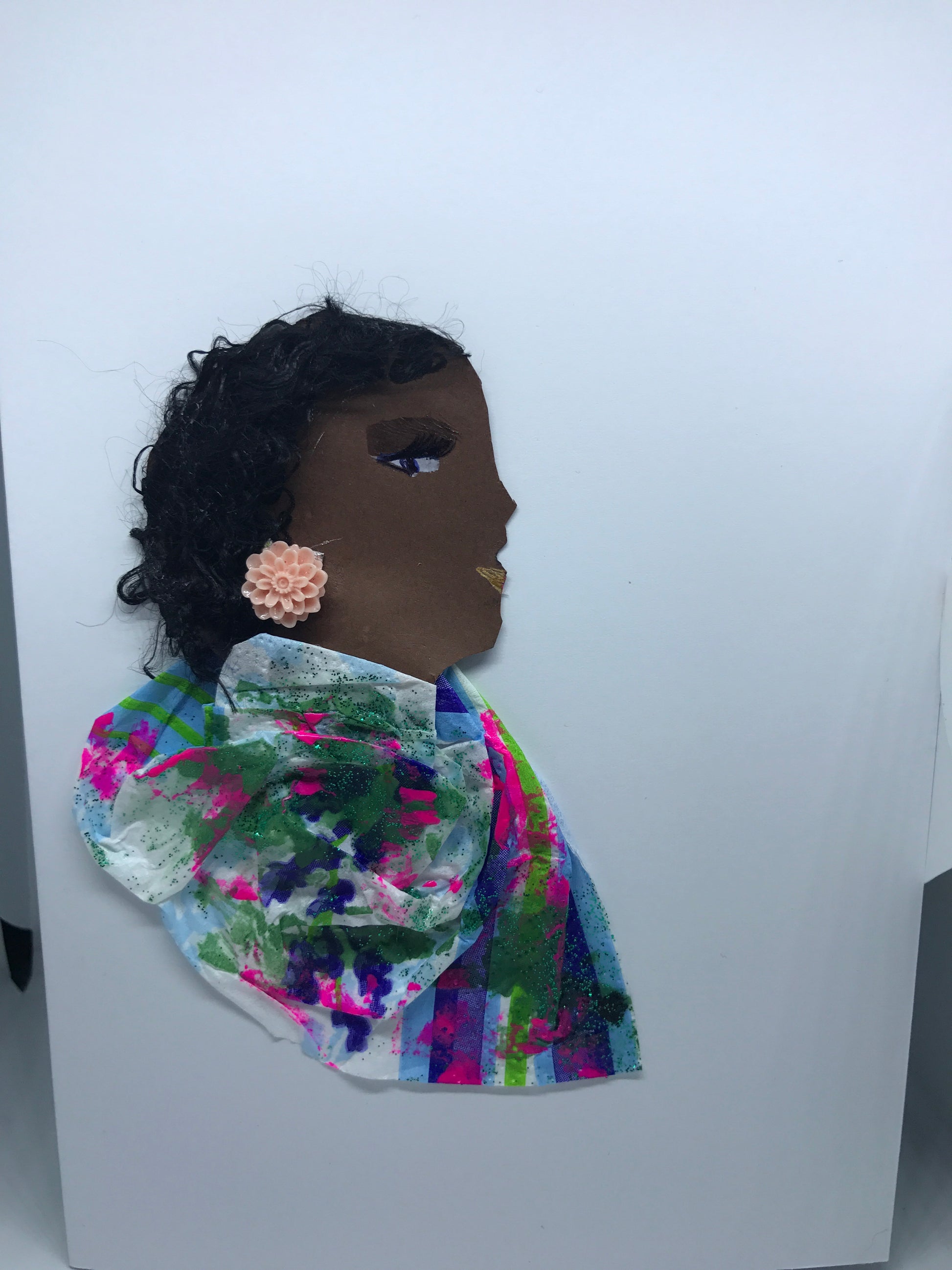She wears a multi-coloured blouse with a blush pink earring.