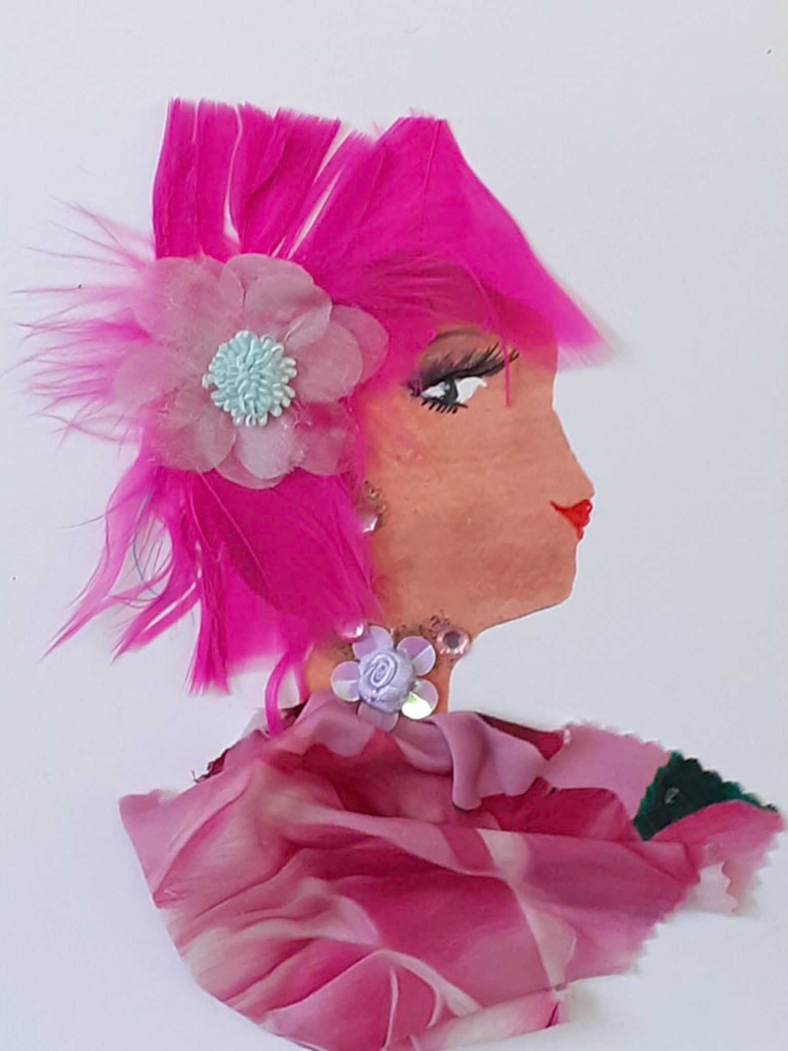 Pink Piccadilly Circus is wearing a pink, and white blouse with a touch of green. She has fuchsIa coloured hair and a large pink flower attached to hot pink feathery hair.