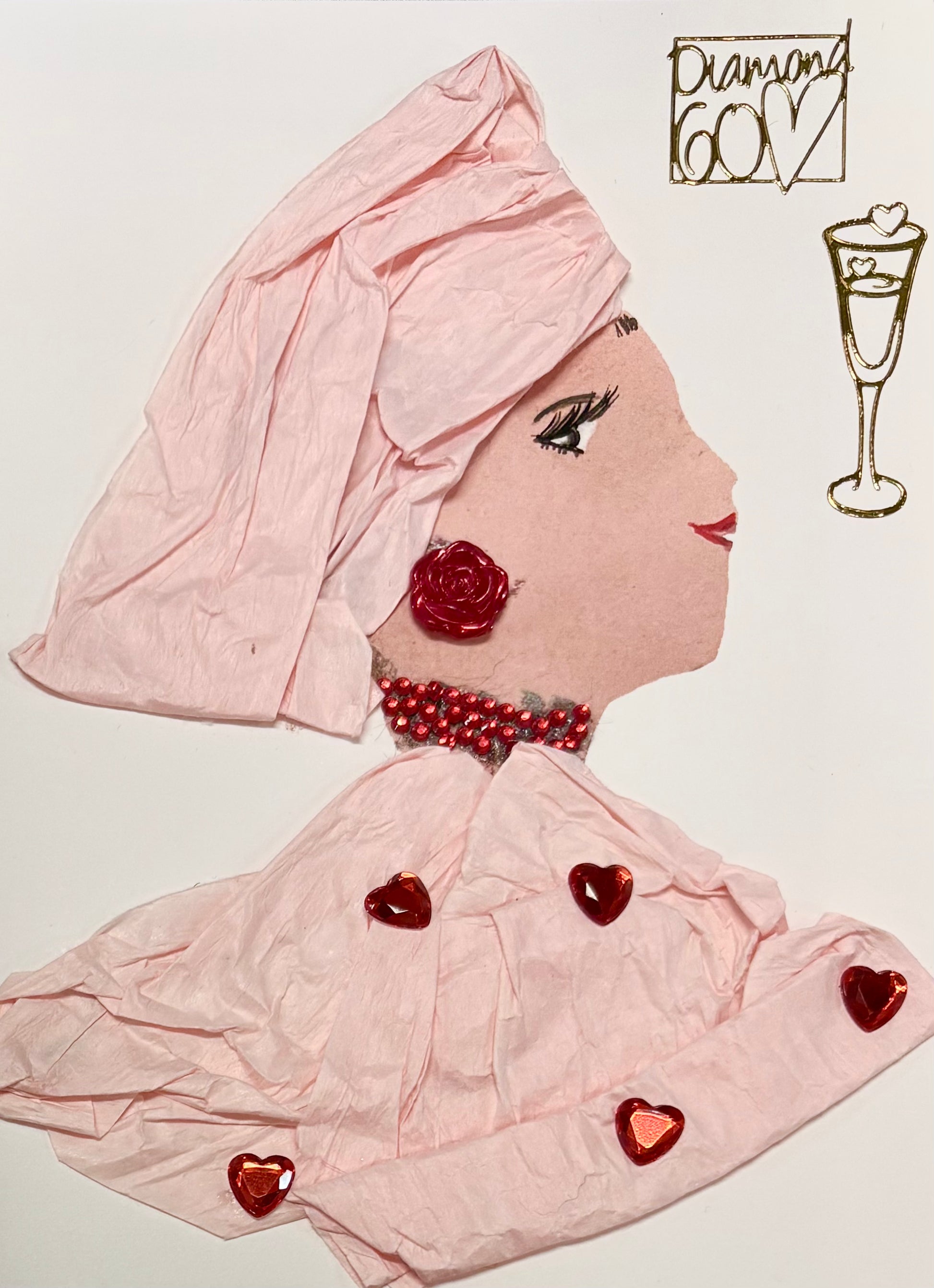 This unique card is perfect for someone's birthday! Featured is a woman with a light pink headwrap and matching pink blouse scattered with hearts. Her red jewellery complements the red heart gems on her blouse!