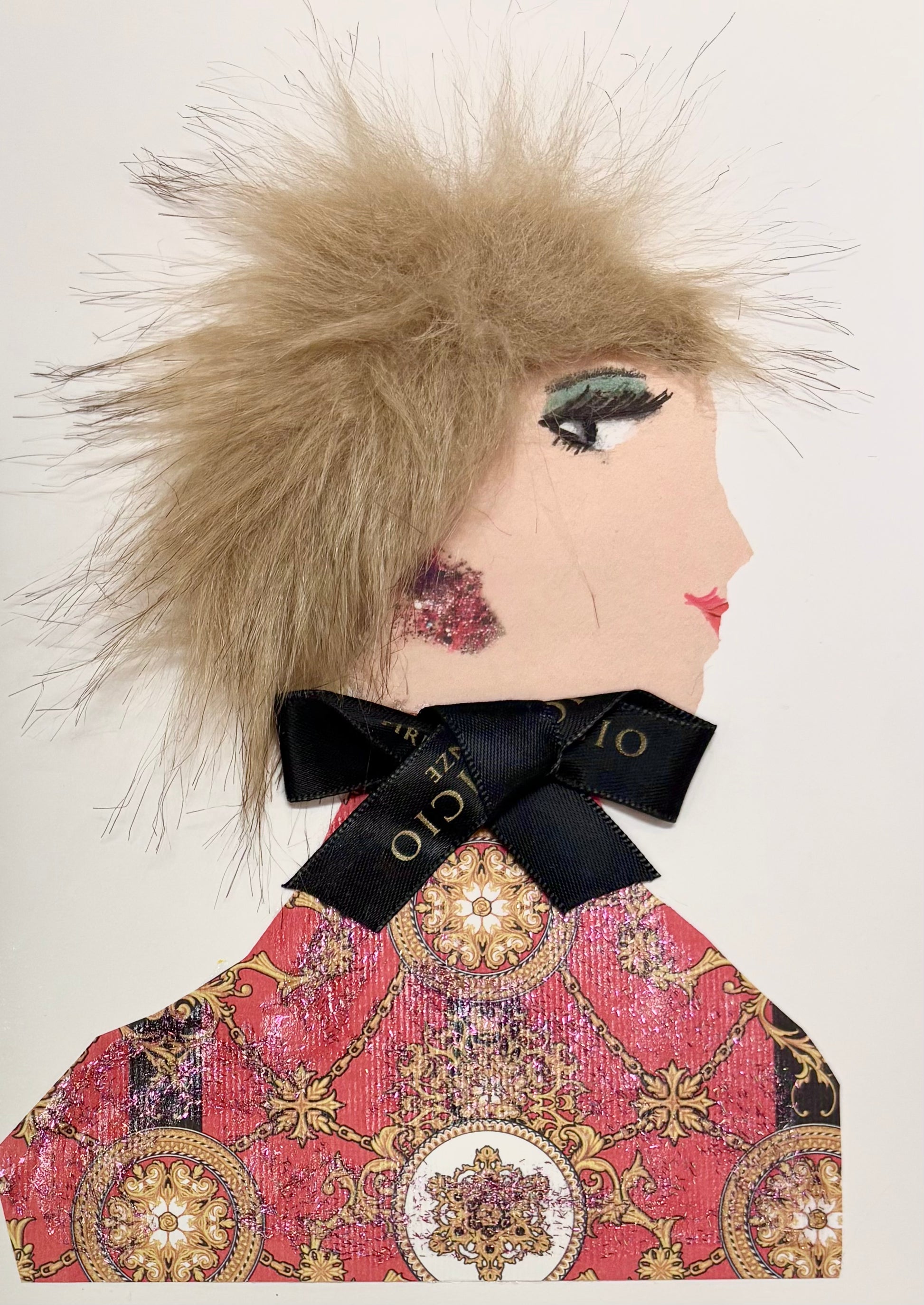 This one of a kind card features a woman with a pink outfit and stunning black bow. Perfect unique card to give to someone you love!