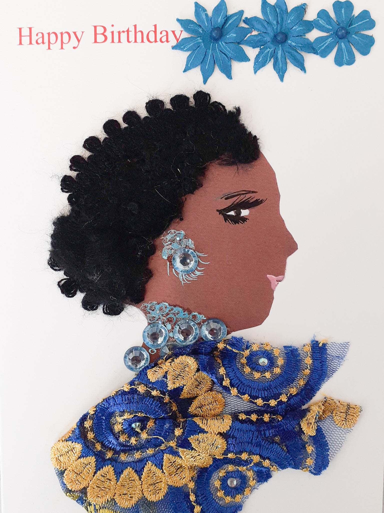 Brunello is wearing a blue and gold patterned dress with aquatic earrings and her curly black hair makes her so beautiful. Above her head is "Happy Birthday" with three blue flowers.