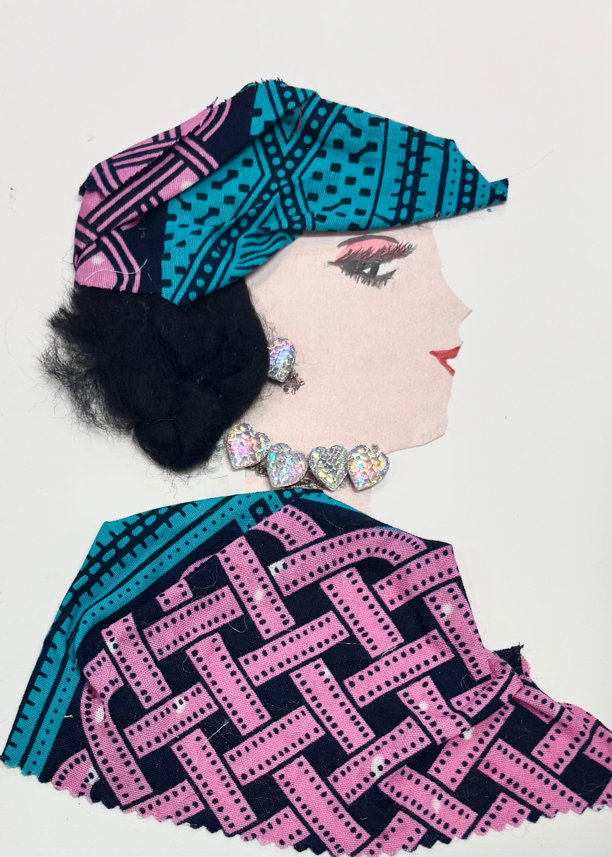 This beautiful card was delightfully handmade. Aria Aldgate wears a matching hat and blouse with a geometric pattern featuring blue and pink. Her sparkling jewellery makes this card shine bright!