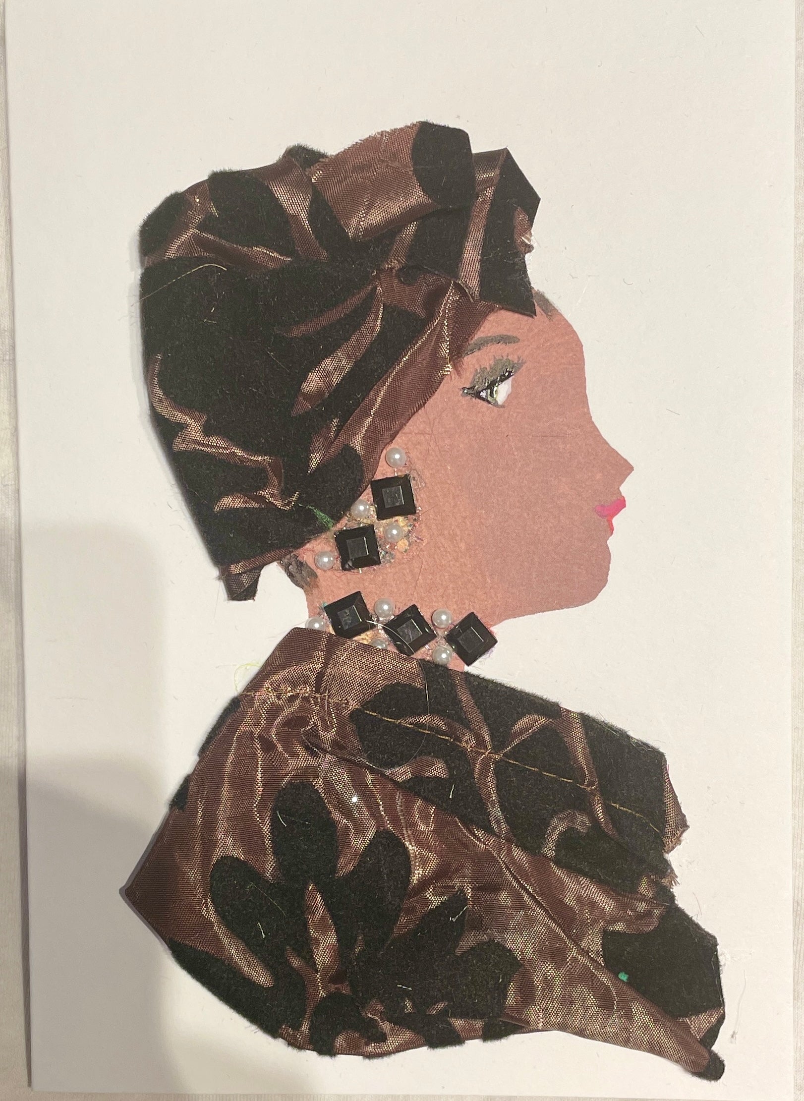 Gold with a brown pattern dress and hat with similarly coloured jewellery