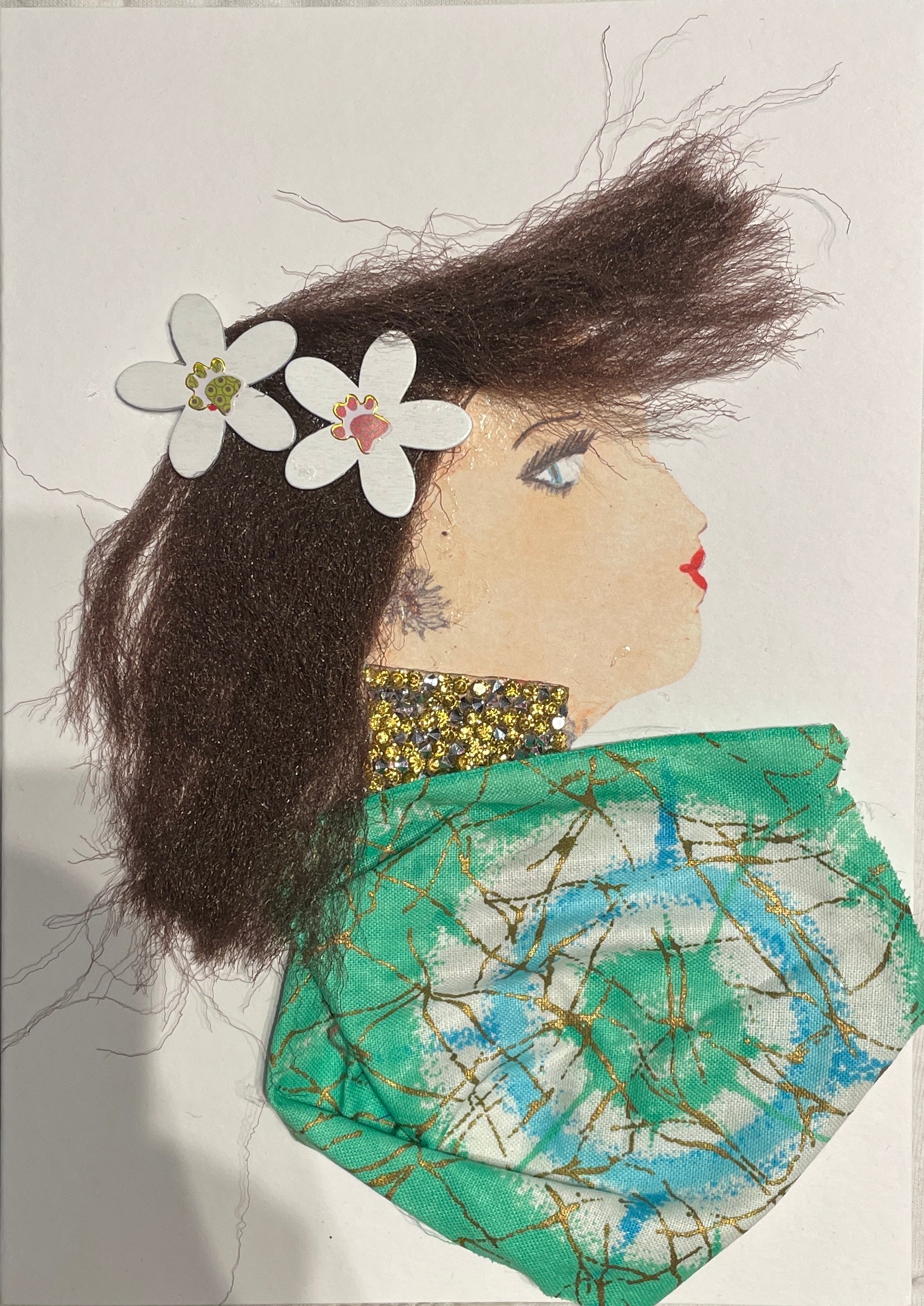 A woman with messy brown hair,a green blouse,with flowers with paws in it and a big gold choker
