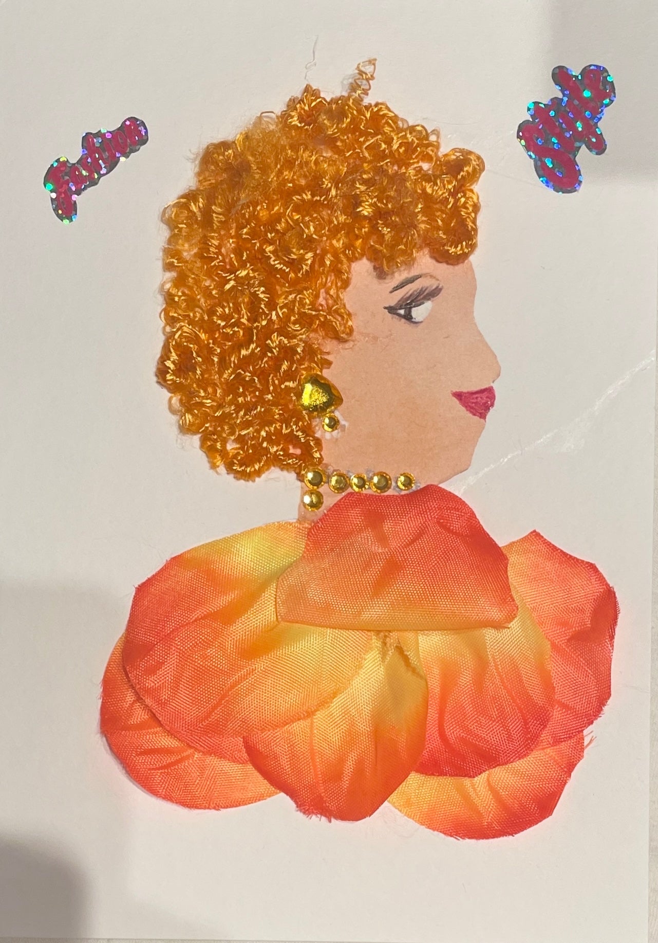 She has a top of petal-shaped orange fabric that perfectly complements her vibrant orange curls.