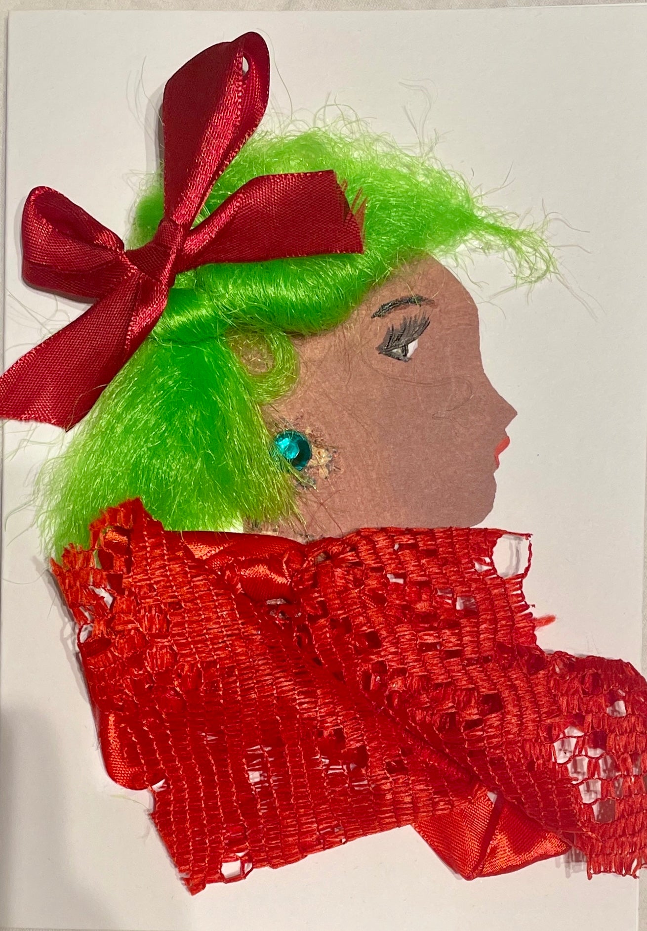 This card depicts a woman with neon green hair that is tied with a big red bow. She wears a flowing red dress to match and wears green earrings to match her hair.