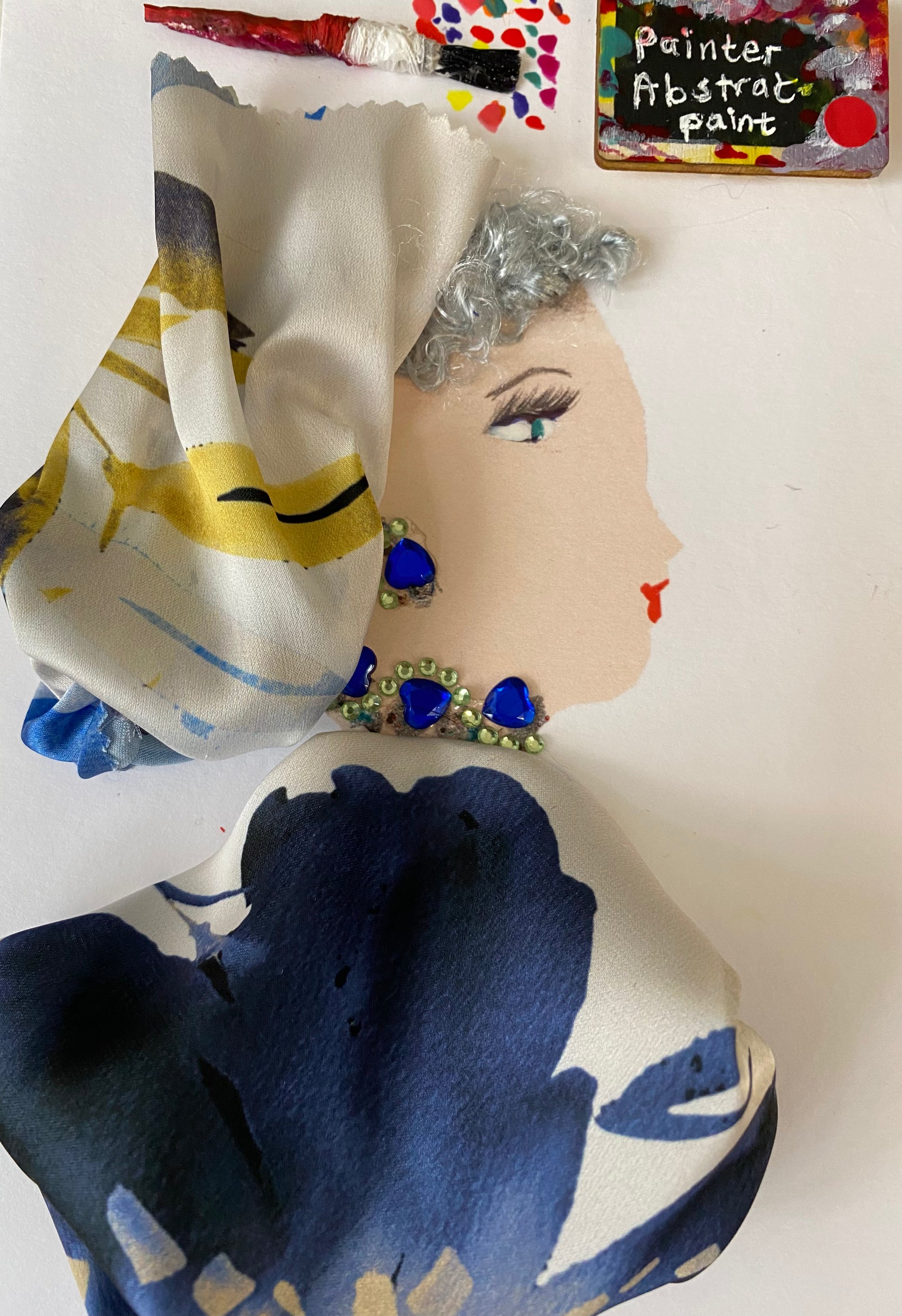 I designed this card of a woman who is wearing a floral head wrap. She is wearing a matching floral blouse. She is wearing blue and green earrings. In the top corner there is a sign that says "Painter Abstract Paint" and next to it there is a paint brush with dots.