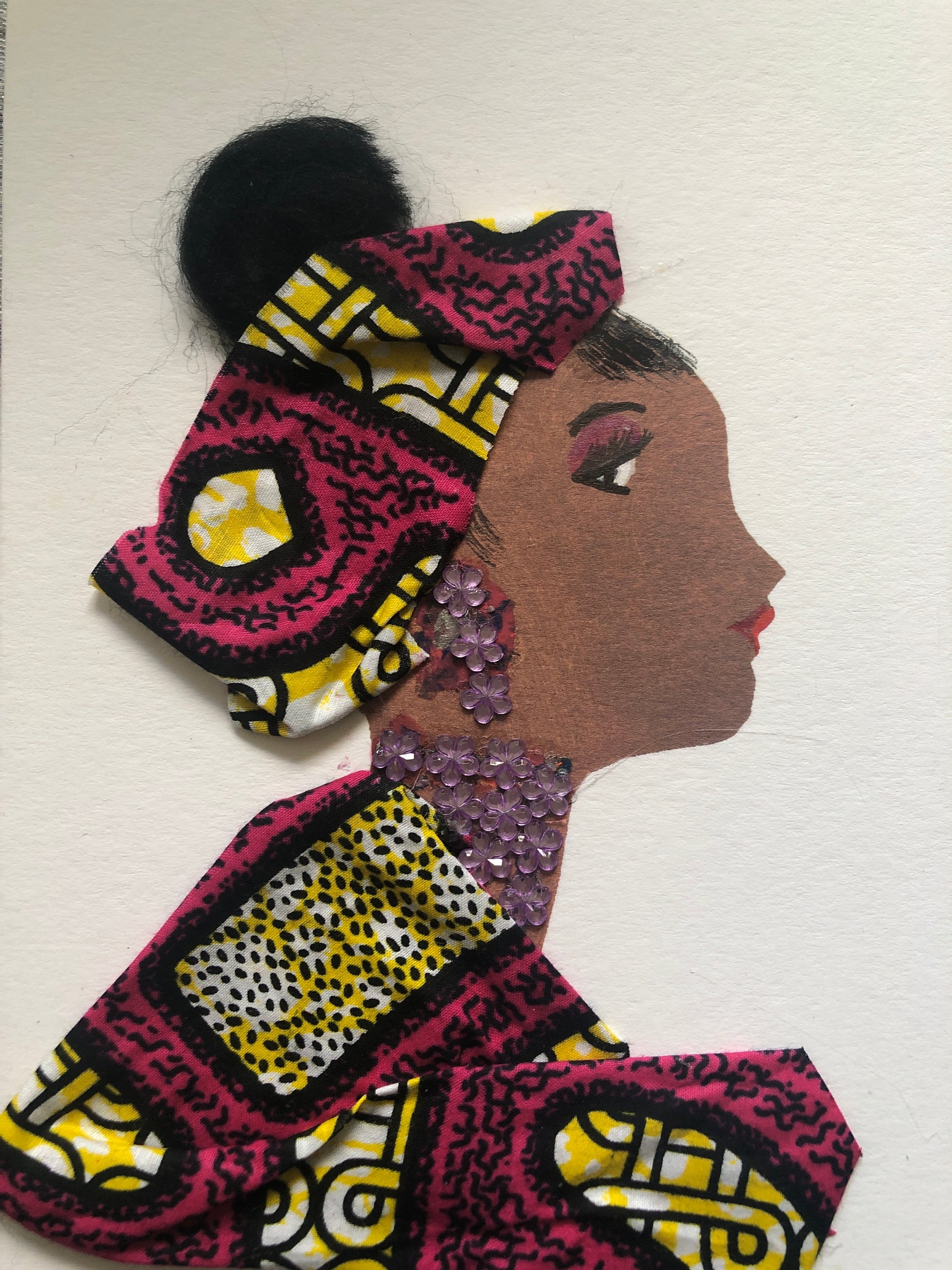 This card shows a woman with black hair wearing a matching pink, yellow and black African-patterned top and head wrap. She wears purple, sparkly jewellery, pink eyeshadow and red lipstick.