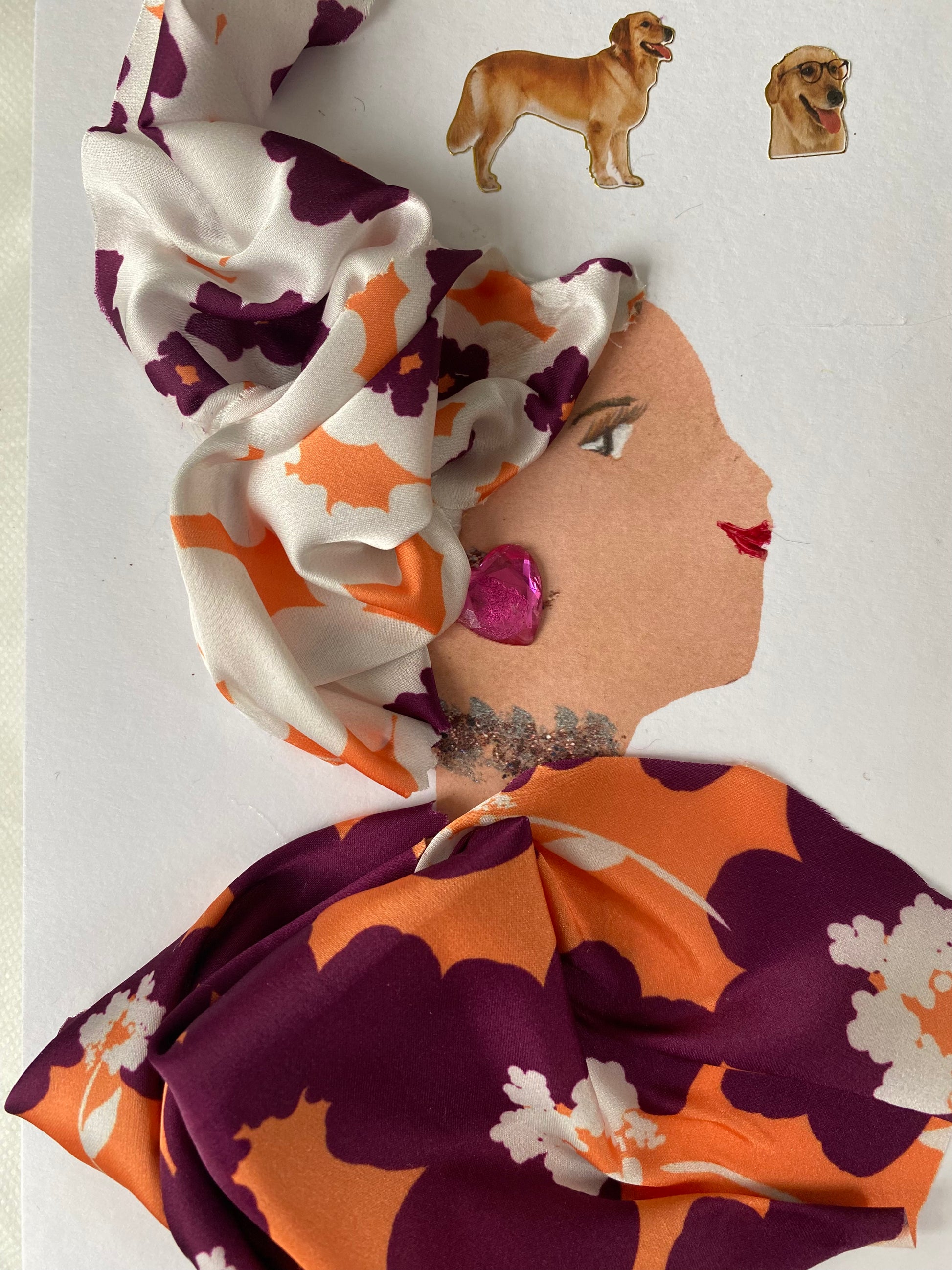 I designed this card of a woman who is wearing a floral head wrap. She wears a matching floral blouse. in the corner there are two dogs.