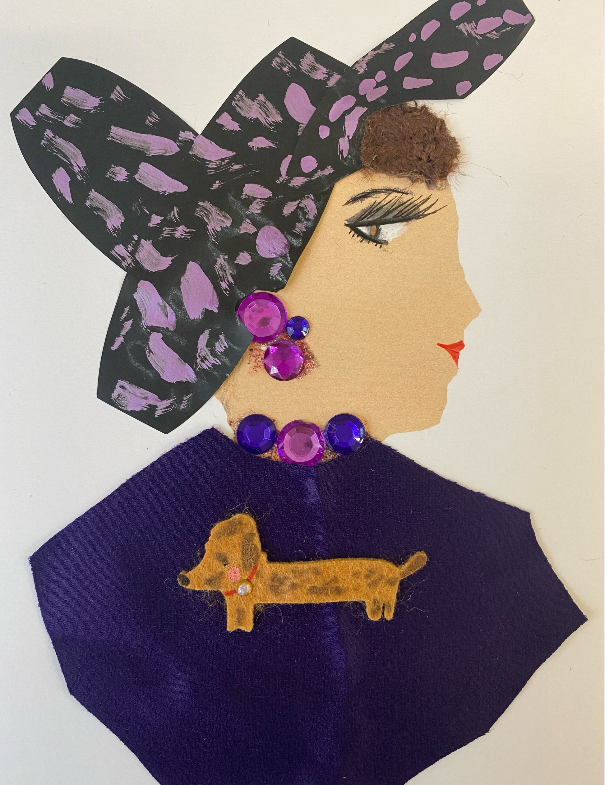 This card is designed for a woman wearing a stylish black and pink hat. Her signature purple blouse is highlighted with an eye-catching gold-plated dog emblem. Finishing the look, elegant purple and pink jewellery glimmers in the light. An ideal choice for the modern collector.