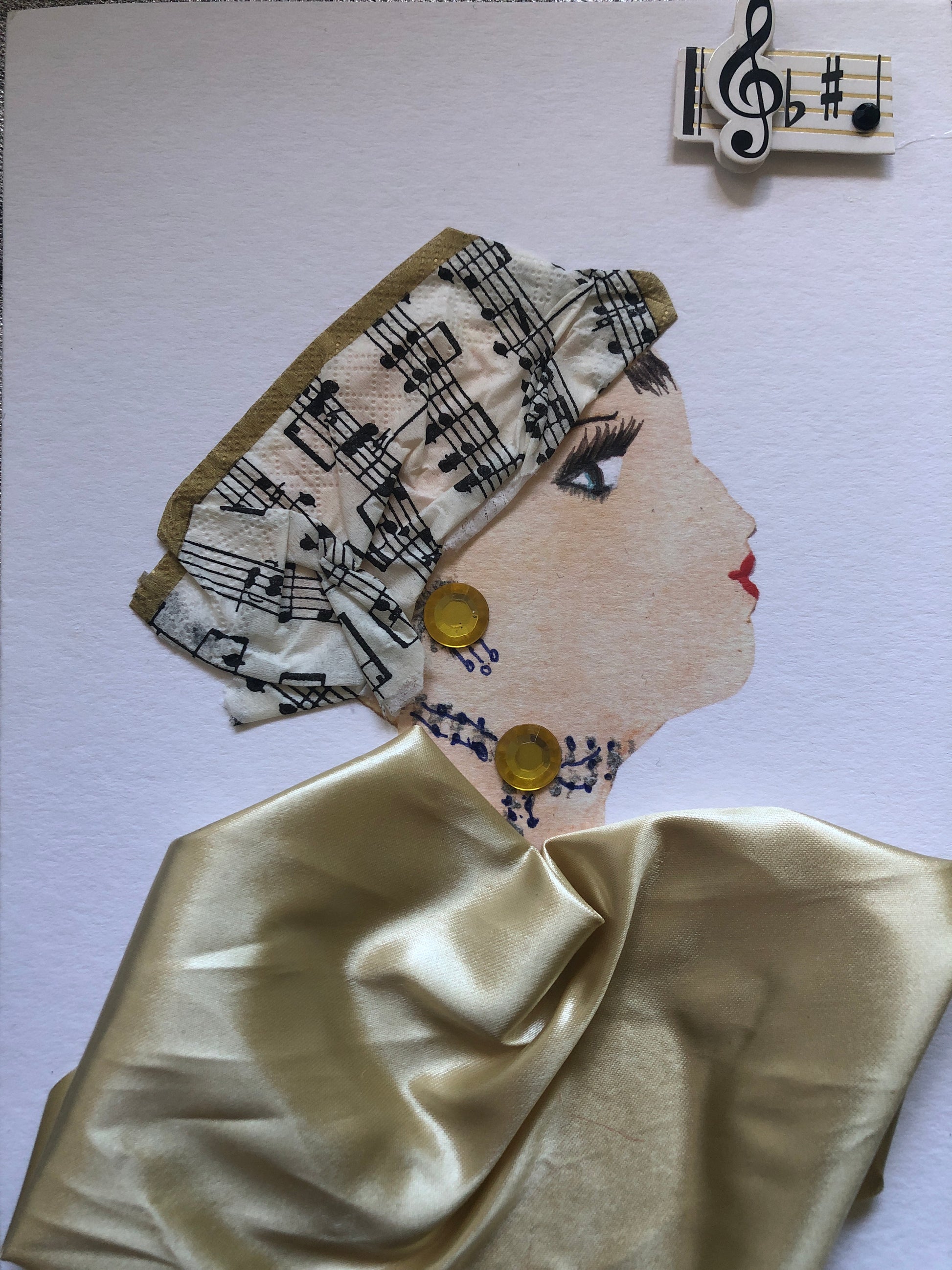 This card shows a woman wearing a yellow satin top with musical notes-patterned head wrap and yellow jewellery. The background has musical notes.