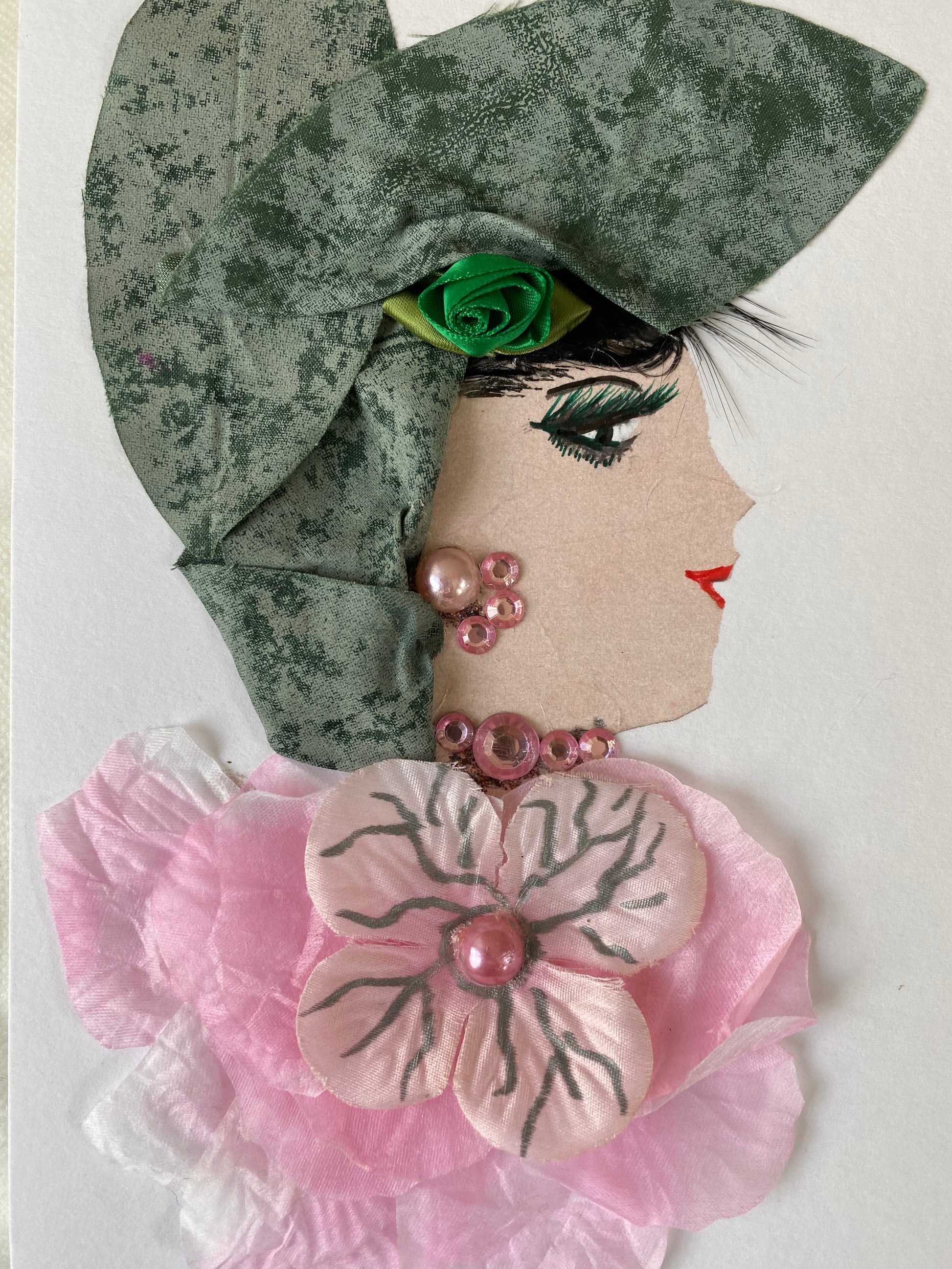 This is a card I designed of a woman wearing a striking green hat. She wears a dazzling pink petal blouse with a flower in the middle. She wears pink pearl jewellery.