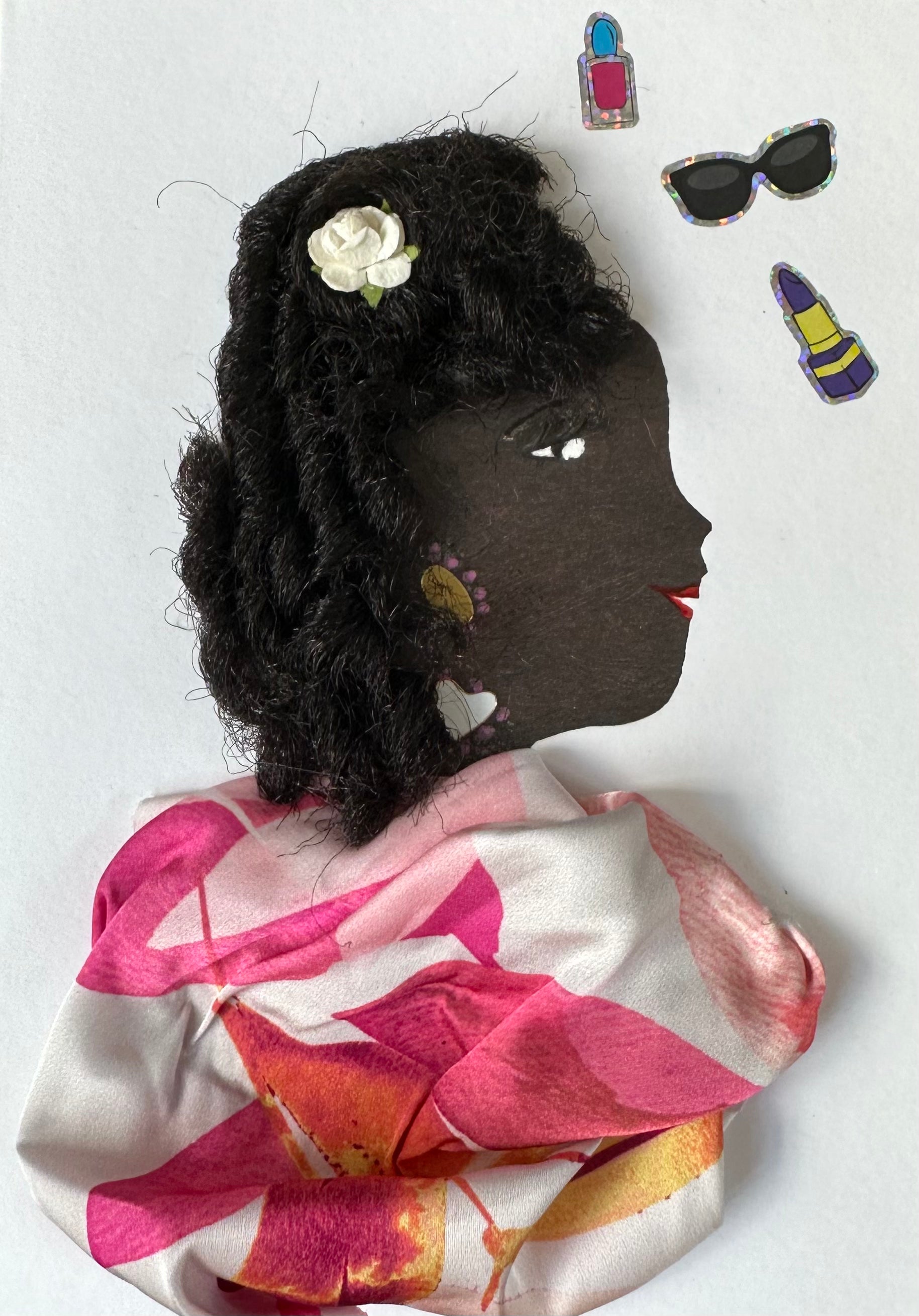 I designed this handmade card of a woman dressed in a pink floral blouse. Her outfit is accessorized with heart-shaped necklace and a white rose in her hair. She also has lip gloss, sunglasses, and perfume with her.