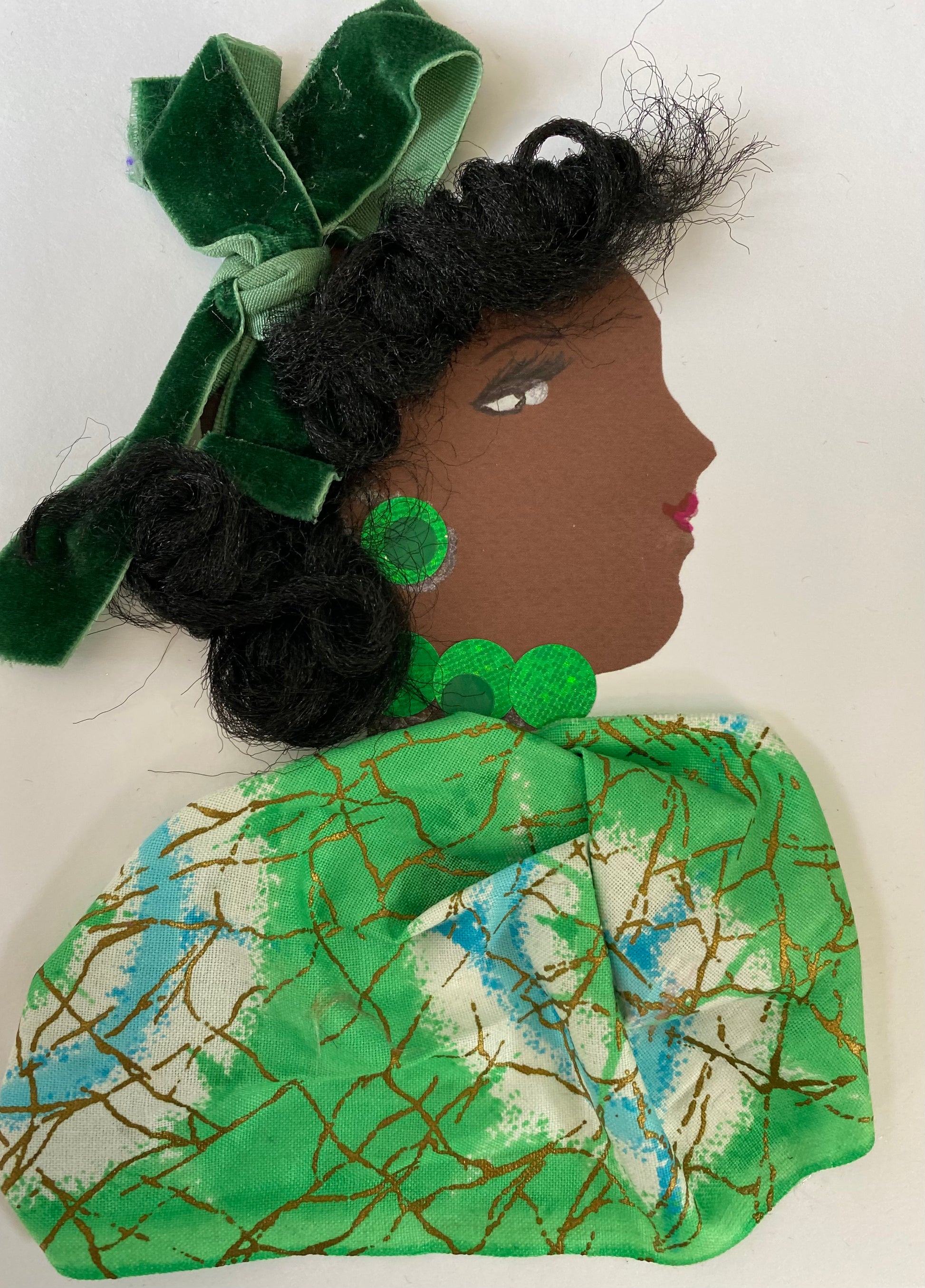 I designed this card of a woman who is wearing a stunning green bow in her hair. She wears a green pattern blouse. She wears sparkly green jewellery.