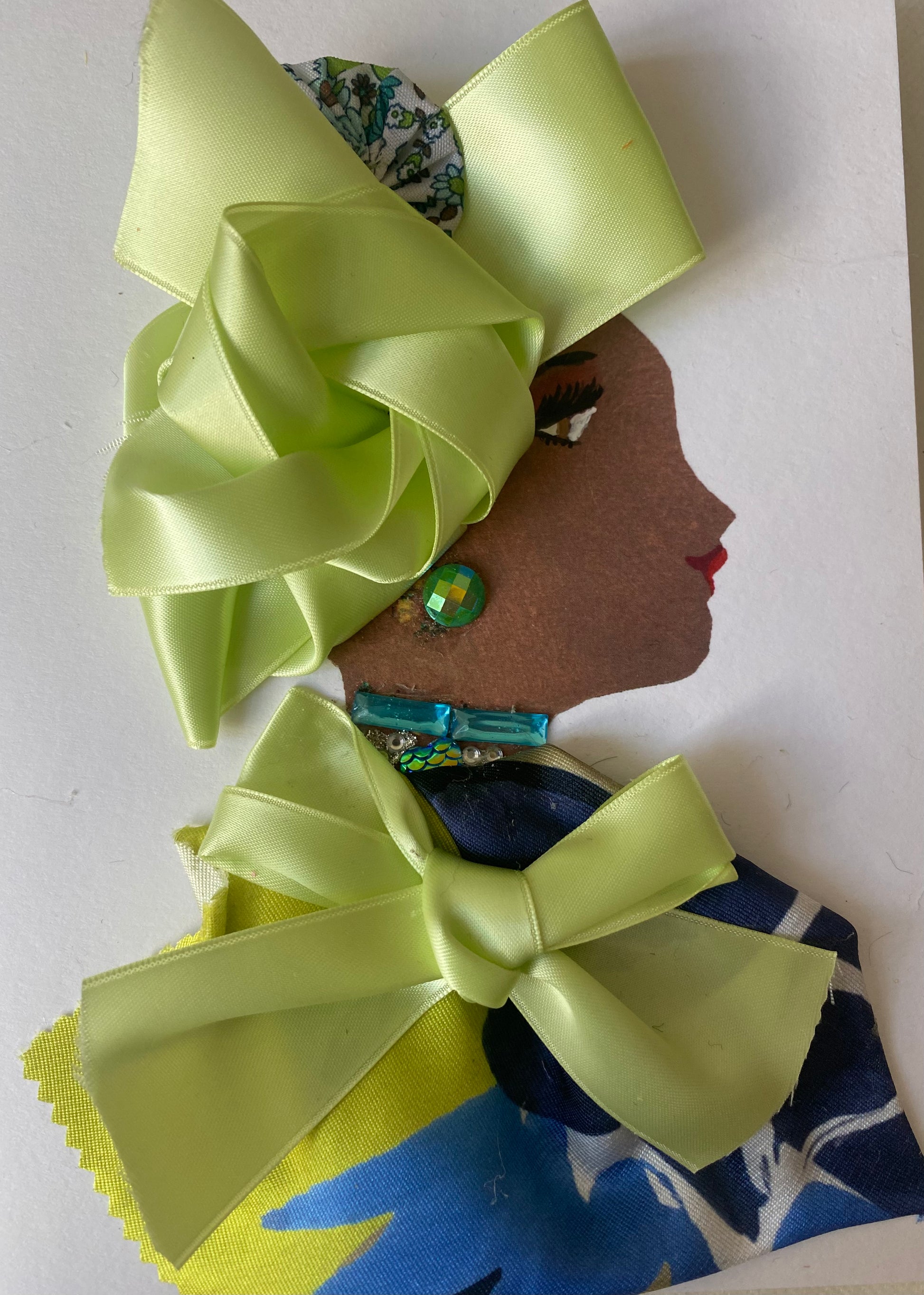I designed this card of a woman who is wearing a lime green silky hatinator. She wears a blue pattern blouse with a silky green ribbon in the middle. She wears blue and green jewellery.