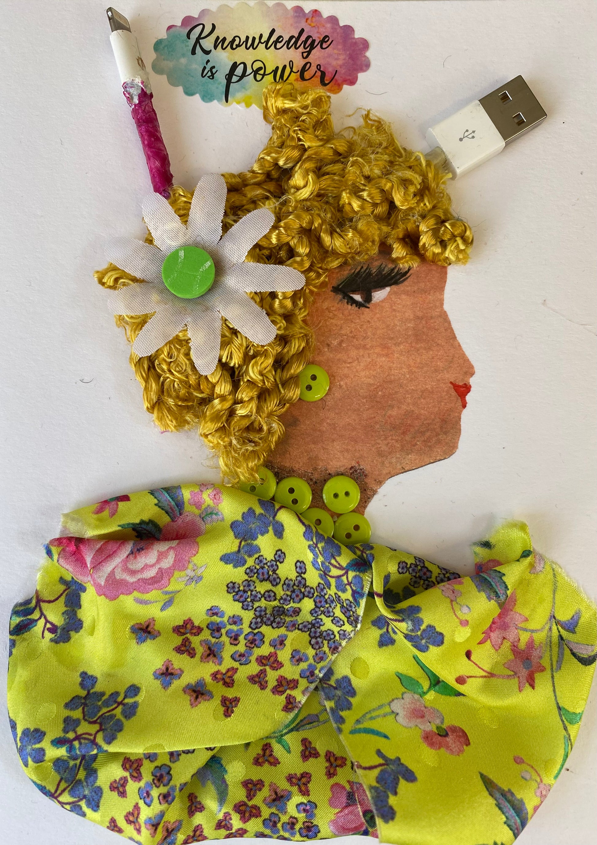 I designed this card of a woman who is wearing a flower in her hair. She is wearing a green floral blouse. She wears green button jewellery. Behind he head there is a pink charging cable and it says "Knowledge is power."