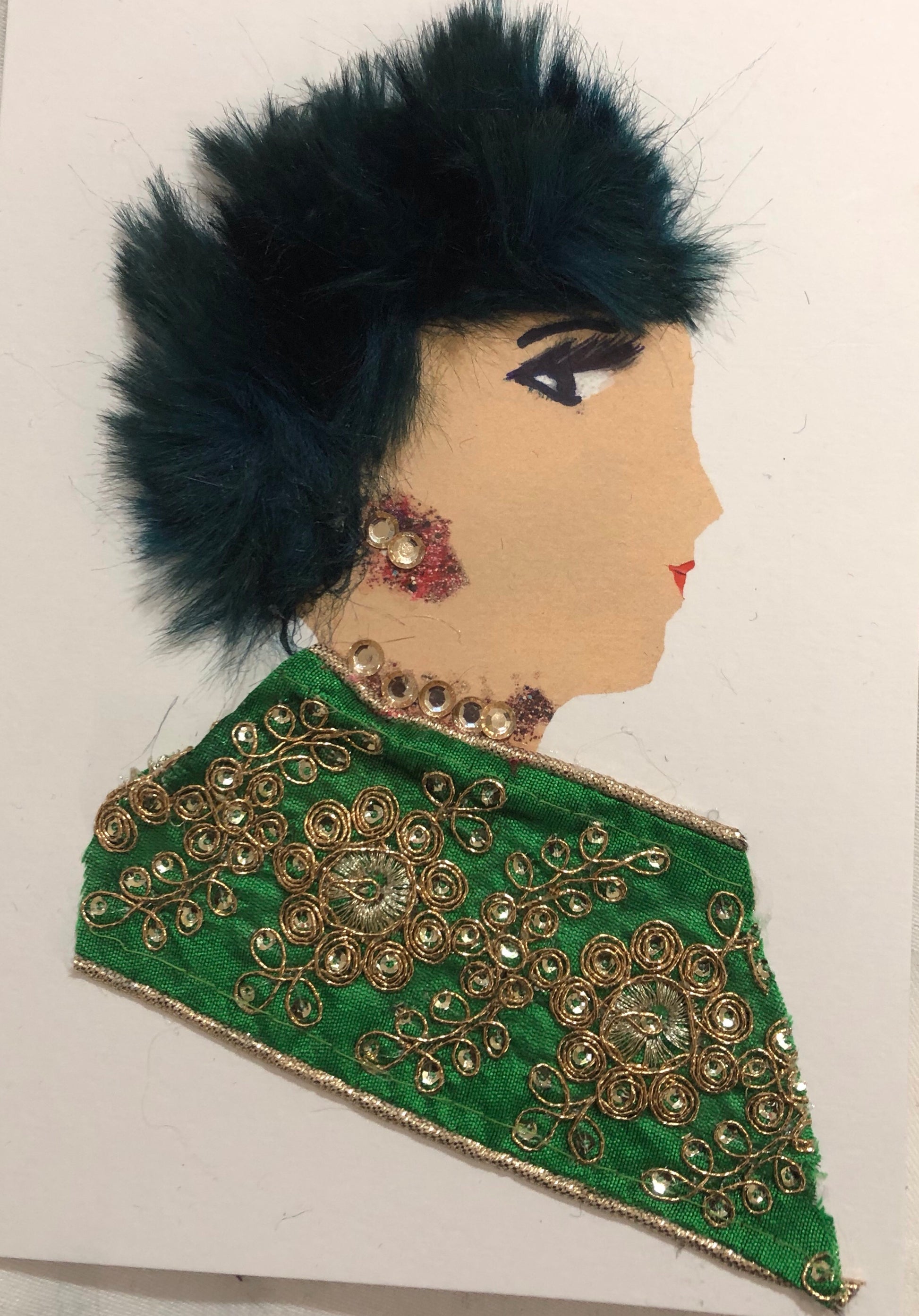 Haley has spiky black hair and wears a very intricate evergreen top.