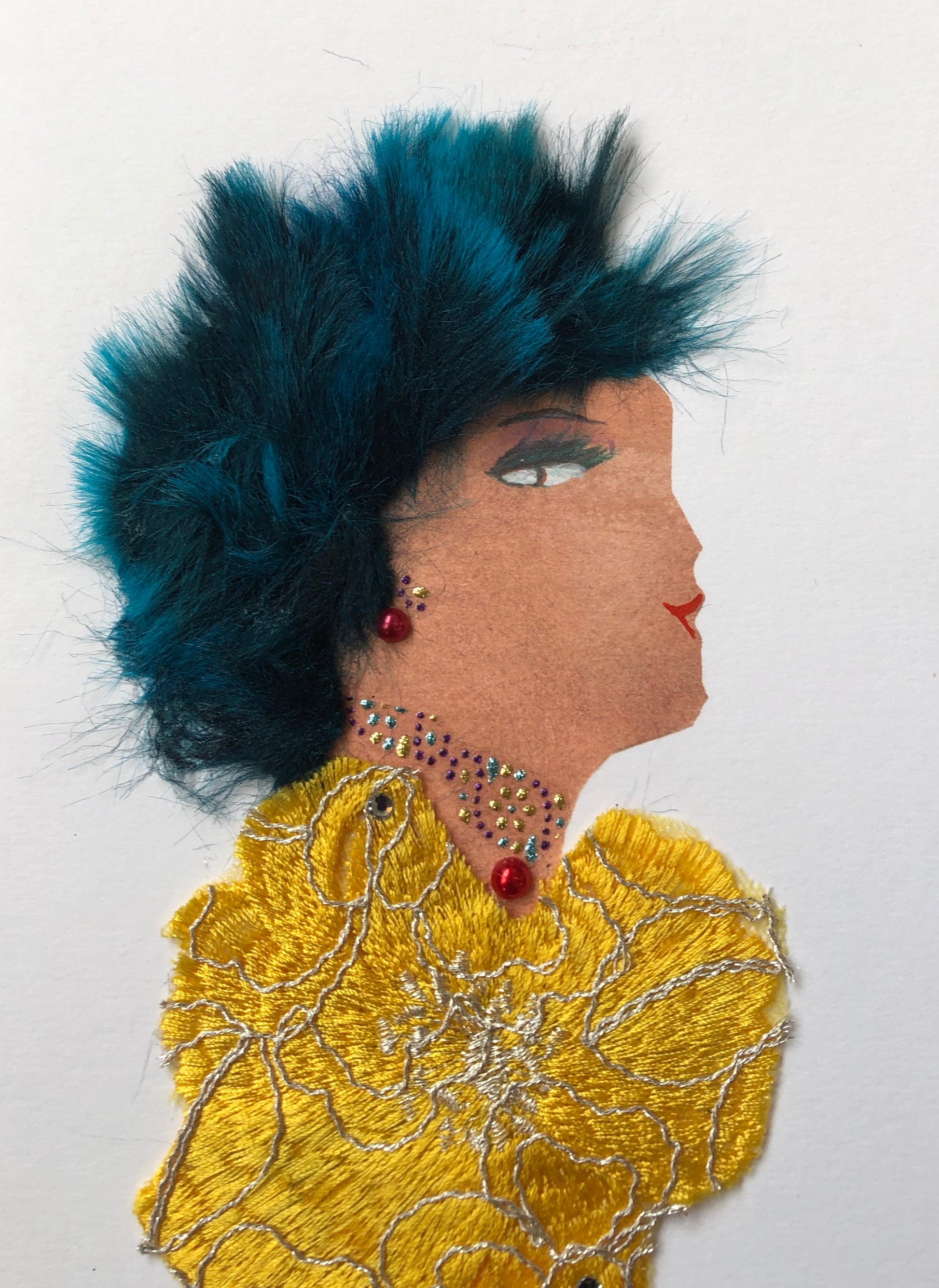 She is wearing a yellow blouse with feathery dark green/blue hair.