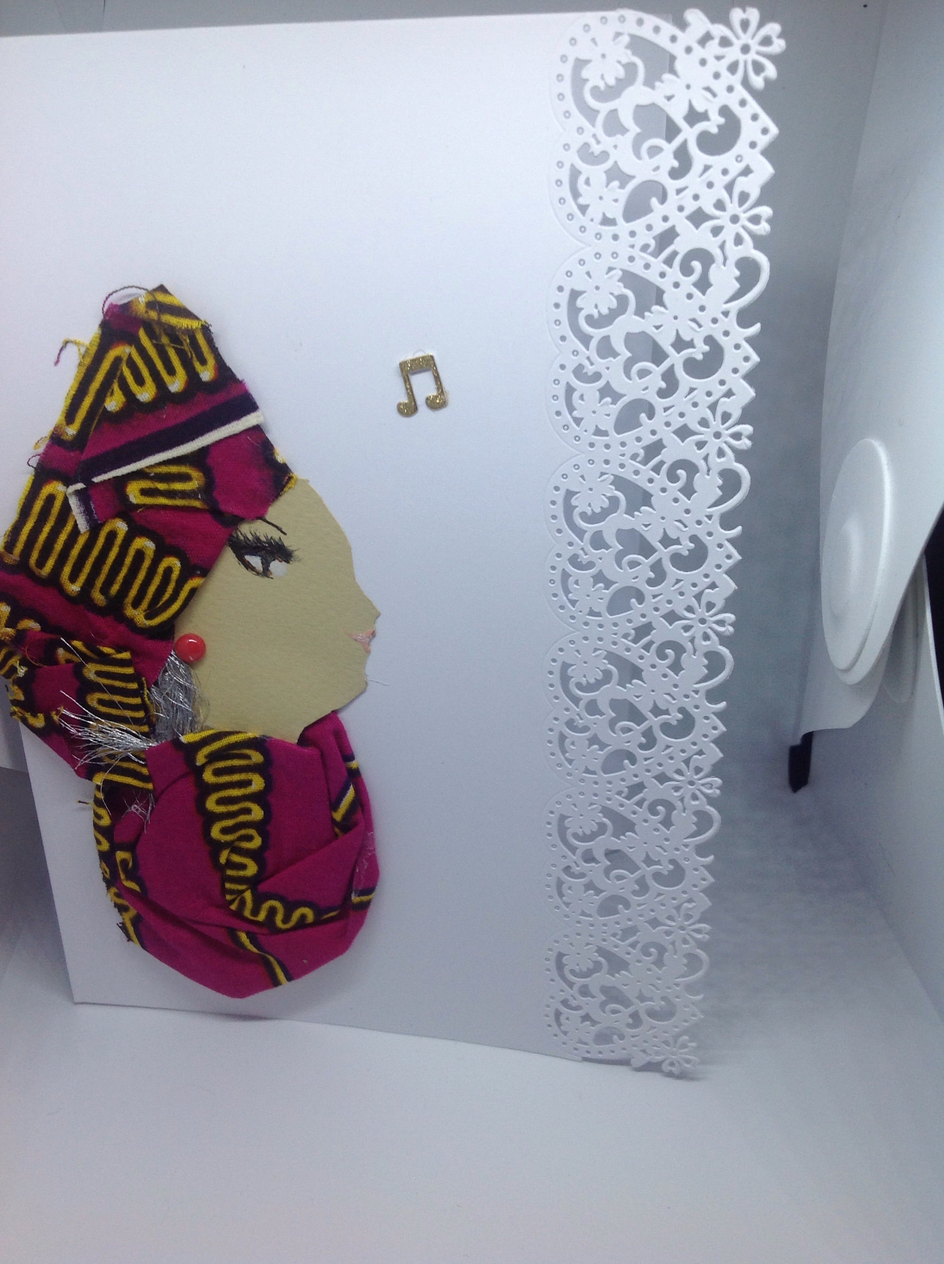 She has a pink and yellow Ankura printed headpiece and blouse. There is a music note on the right side as well as a detailed edge.