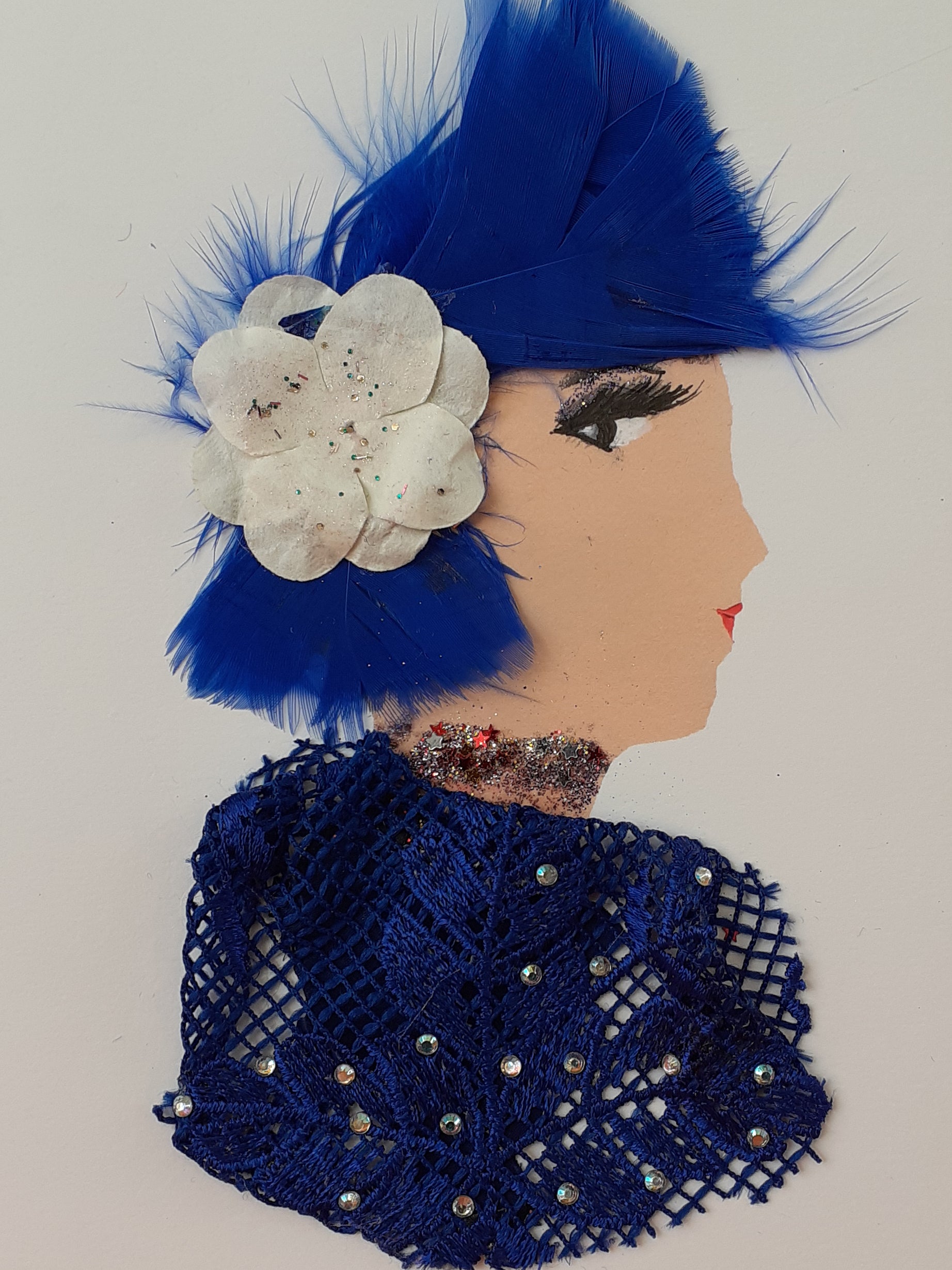 This card shows a beautiful woman wearing navy blue embellished with rhinestones. She has a large white flower on the side of her royal blue feathery hair, and her deep blue blouse is embellished with sophisticated rhinestones.