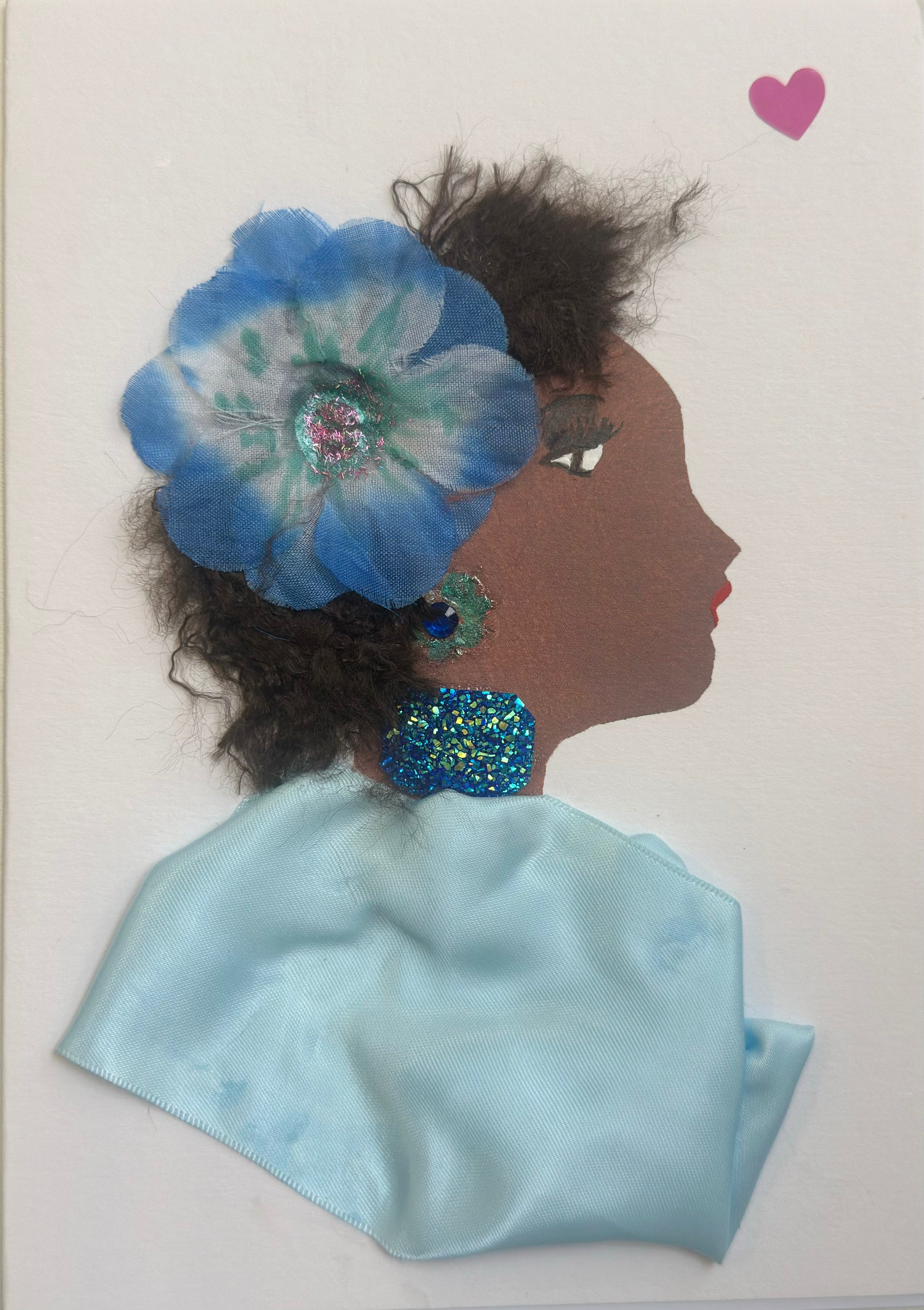 I made this handmade card of a woman named Azure Abbey. Her look is crowned with a large blue flower and a cascade of glittery embellishments, while a smooth satin blue wrap gives her a dreamy, oceanic poise.