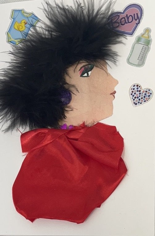 Baby Boo is wearing a beautiful, satin red blouse. She has black wispy black hair.