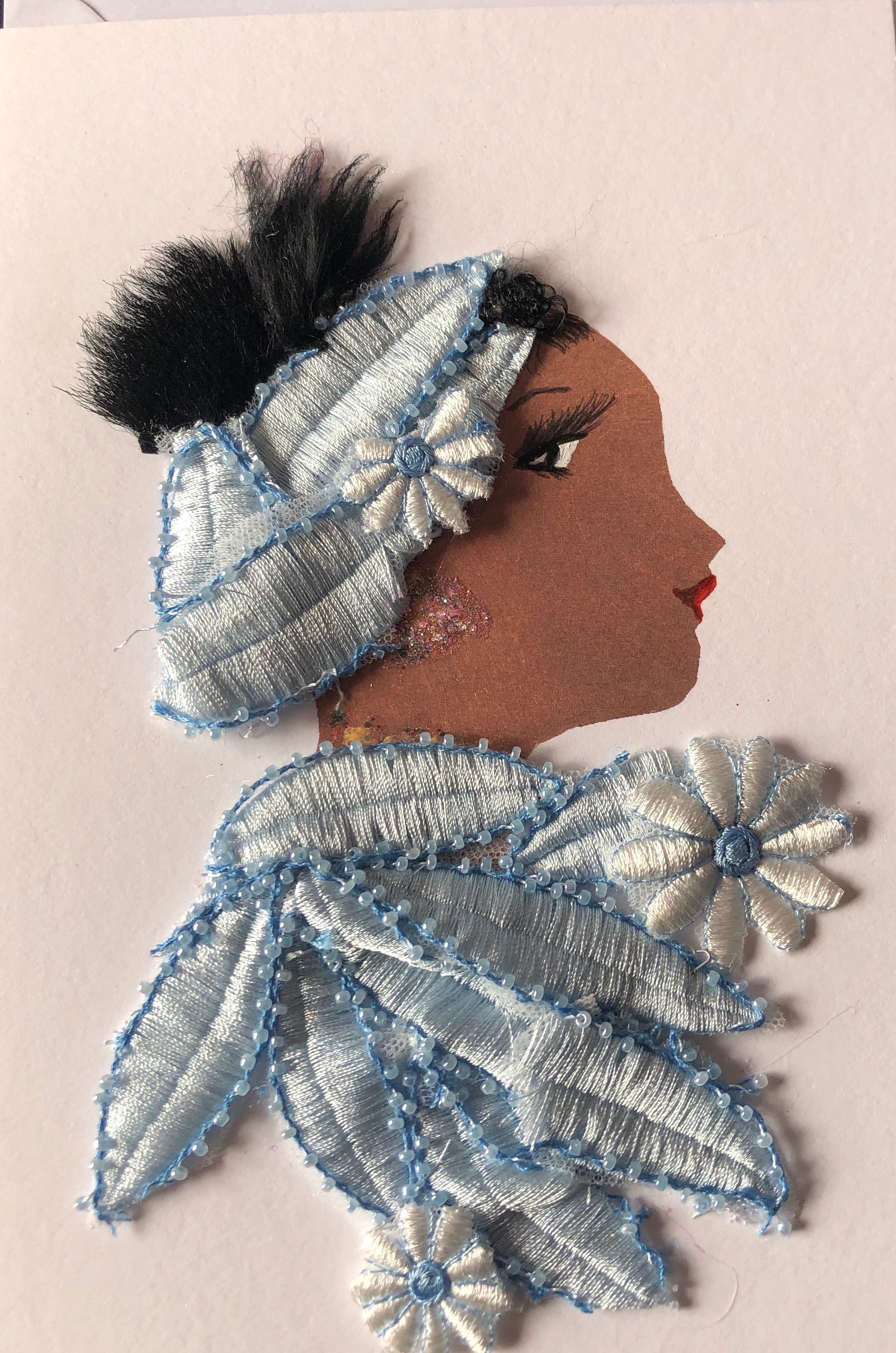 This gorgeous card is named Beckton Bonita. She is wearing a sky blue leaf/flower design with a matching hair wrap.