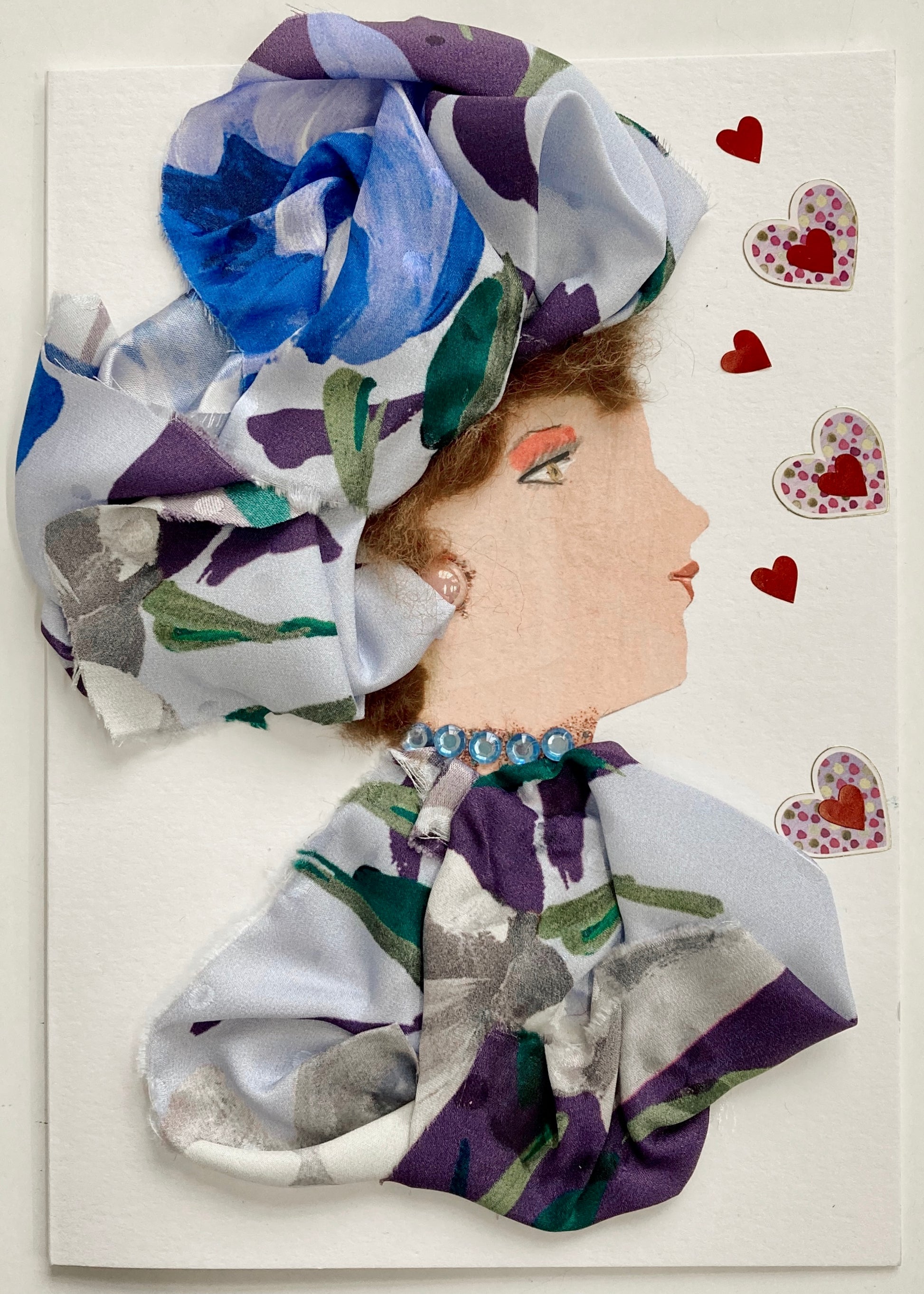 Jakkie Brown is wearing a light blue matching floral patterned blouse and head wrap. She has brown hair and her jewellery is light blue. There are two hearts on the right side.