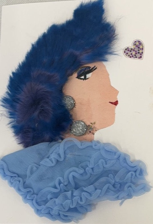 Fiona Florida is wearing an elegant, light blue ruffled blouse. She has dark blue fuzzy hair. She is also wearing matching silver jewellery.