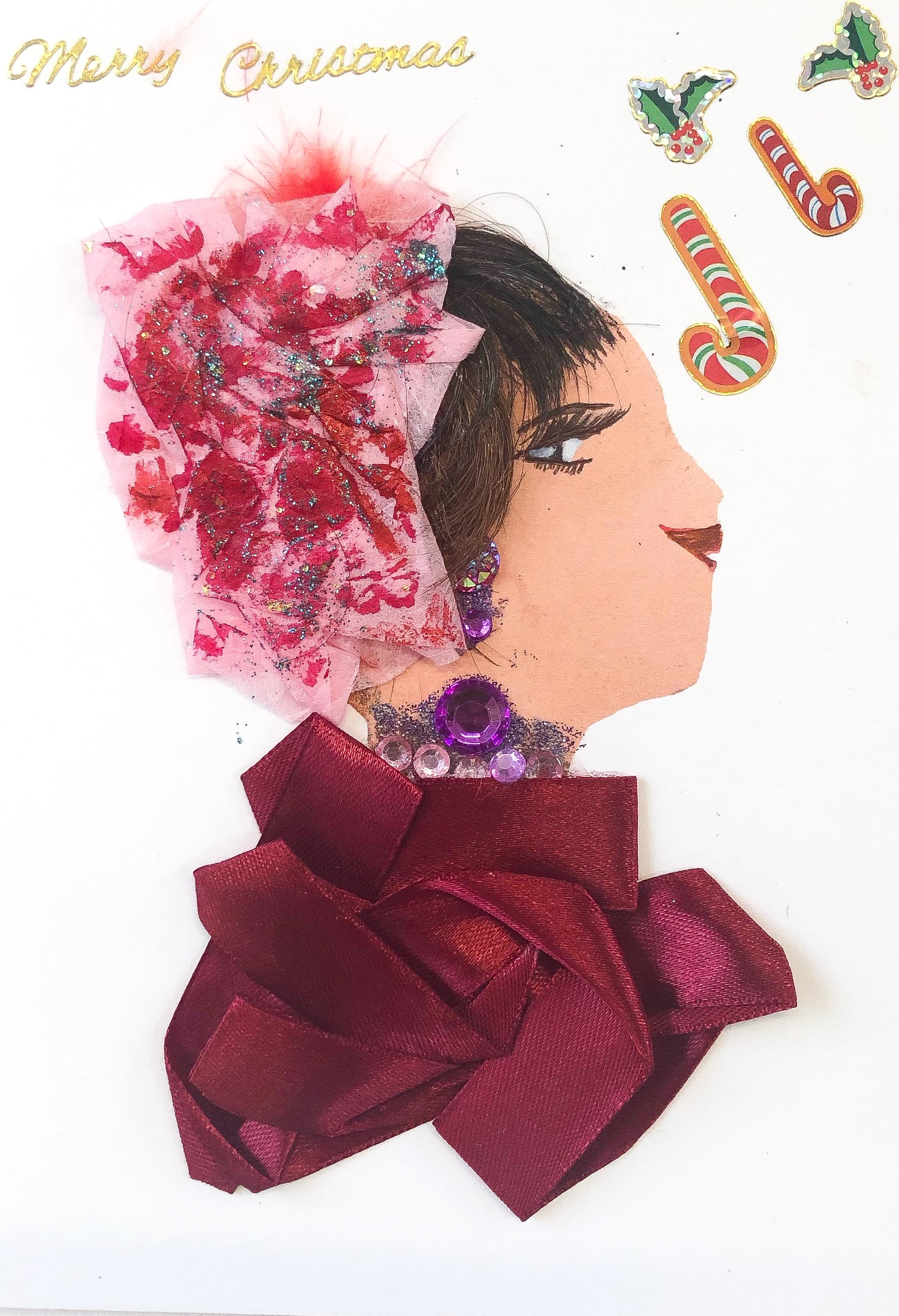 Sparkle Tree is a sweet lady with a smirk on her face. She is in a maroon top complimented with a purple necklace. In her hair, she has a beautiful headpiece with pinks and reds. The card says "Merry Christmas" with some candy canes and holly leaves at the top.