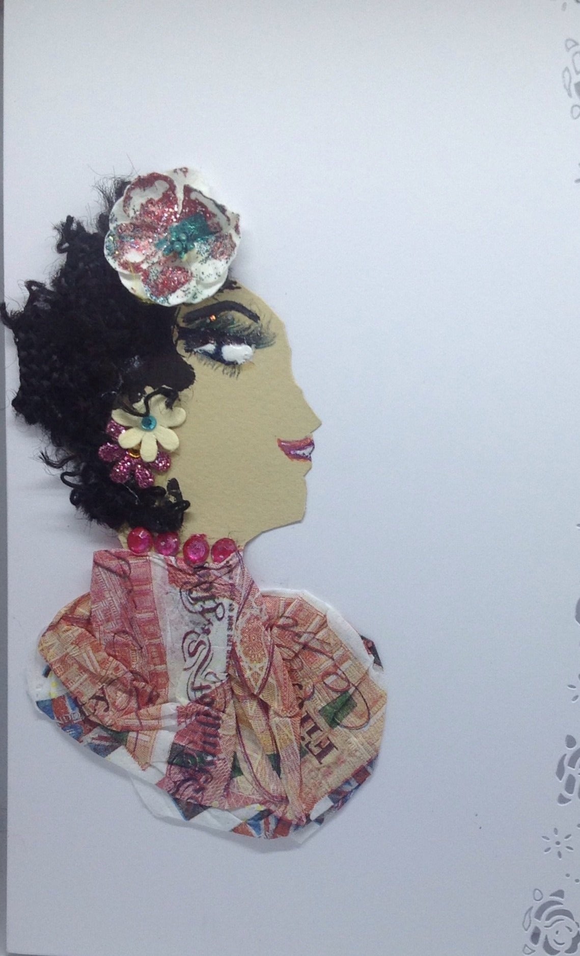 She is wearing a multi-coloured outfit to match her multi-coloured headpiece.