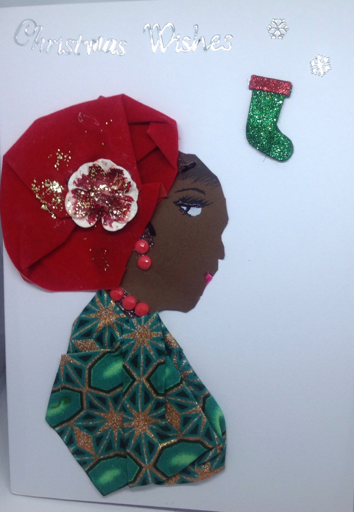 She is wearing a multi-coloured green and orange outfit with a red headpiece. Within the red headpiece, there is a white and red flower pin to match her red jewellery. At the top of the card, it says "Christmas wishes" in silver with some silver snowflakes. There is also a green and red stocking on the right.