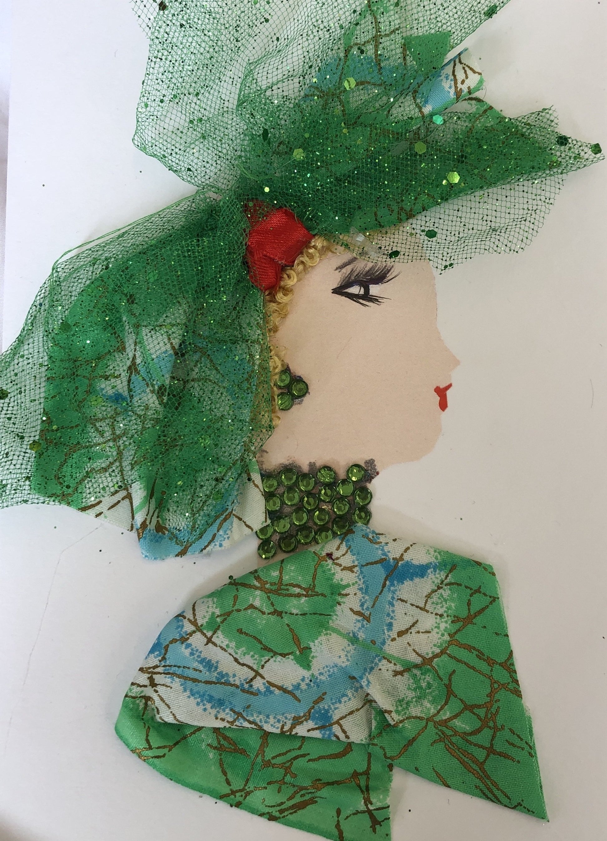 She is dressed in a beautiful green wardrobe ranging from her headpiece down to the designer green blouse. She is also adorned with some green jewelry and a red spot in her hair.
