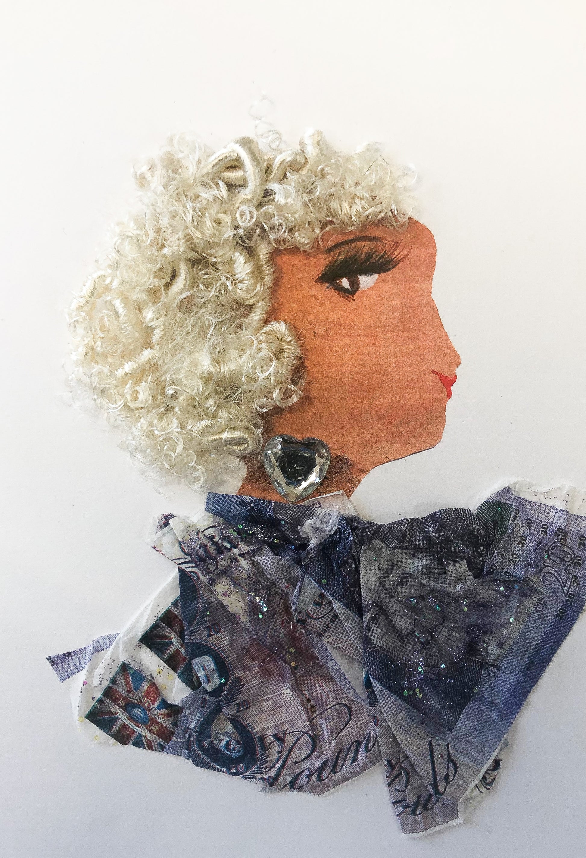 Zere has got white with gray shades and short curls as sea waves, her skin is tanned. She has got long eyelashes and red lipstick. She is wearing a necklace with a shape of heart which is a between dark and purple silver color and her blouse has a design like twenty pound notes.