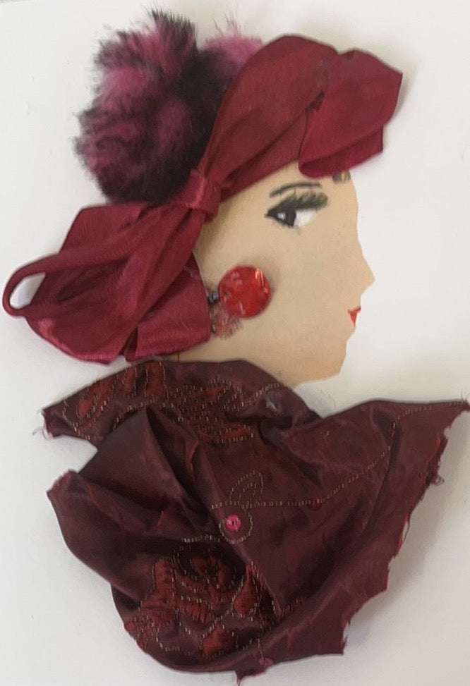 Damilola Dalston is wearing a sophisticated maroon red textured blouse. She has red hair and a red bow in it. She has stunning red jewellery on.